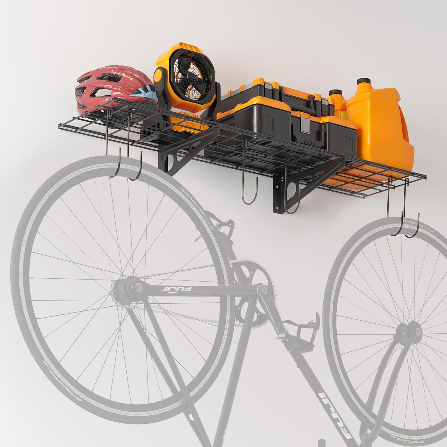 1x4 ft Garage Shelving with 6 Bike Hooks, 1-Pack Wall-Mounted Shelve for Garage, Kitchen, Pantry Storage, 150 lbs Total Load Capacity Wall Shelving, Black