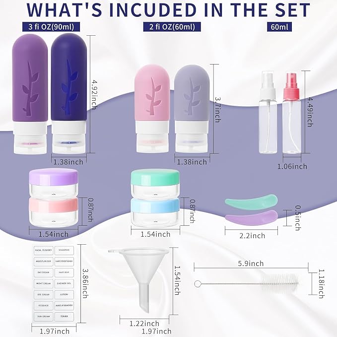 - Designed for Travel Accessories: Our 18 pack reusable travel bottles set with 1 waterproof bag, 2 pcs silicone bottles (3 oz/90 ml), 2 pcs silicone bottles (2 oz/60 ml), 2 pcs spray bottles (1.05 oz/30 ml), 4 pcs cream jars (0.35 oz/10 ml), 1 pcs funnels, labels, brush and 2 pcs spatula! Different accessories for your different needs