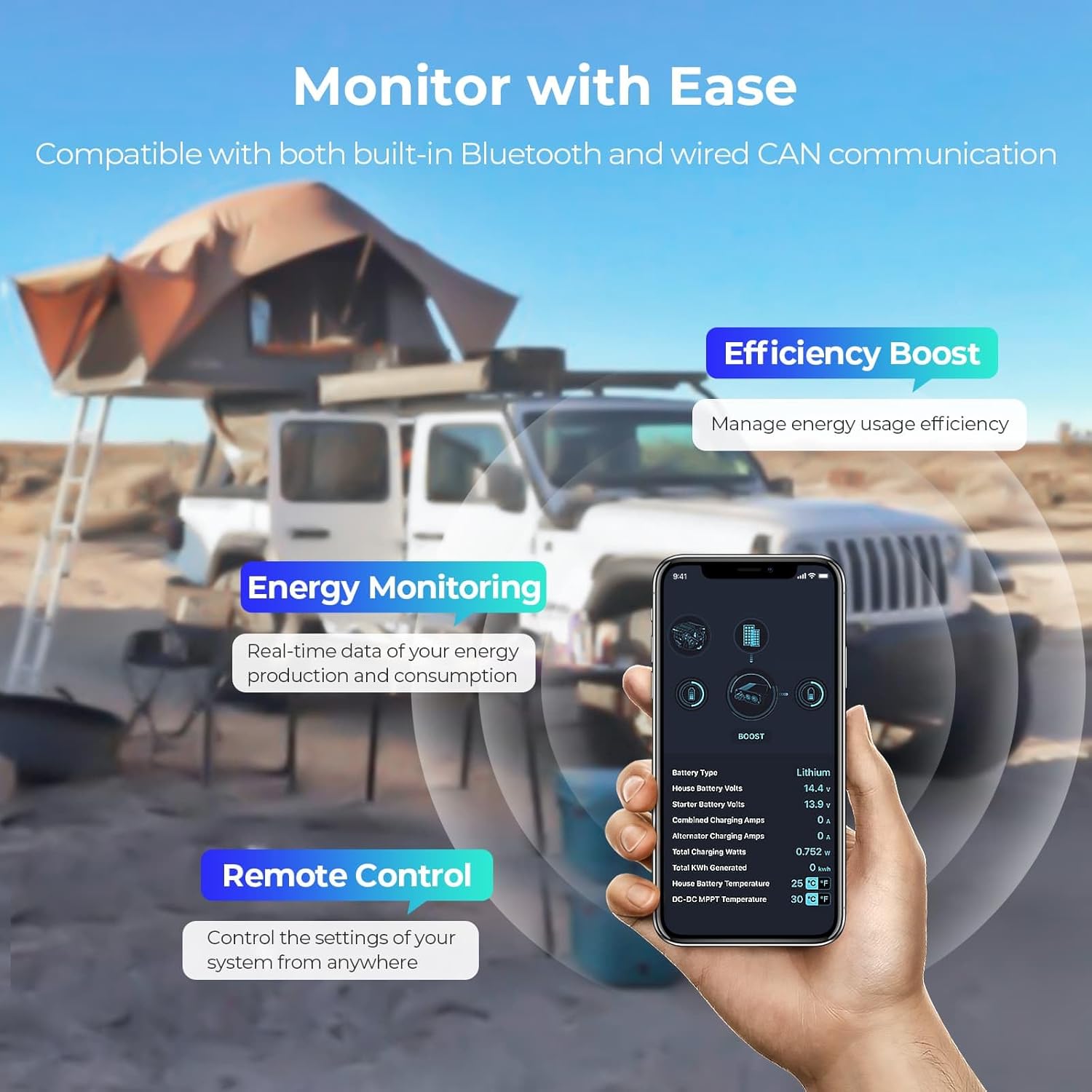 - 𝐑𝐞𝐦𝐨𝐭𝐞 𝐌𝐨𝐧𝐢𝐭𝐨𝐫𝐢𝐧𝐠 & 𝐃𝐮𝐫𝐚𝐛𝐥𝐞 𝐁𝐮𝐢𝐥𝐝: Monitor power data in real-time via Bluetooth (DC Home app/Renogy One Core) or wired CAN communication for control. Protected by a sturdy, drop-resistant sheet metal casing, ensuring long-lasting performance in mobile applications.