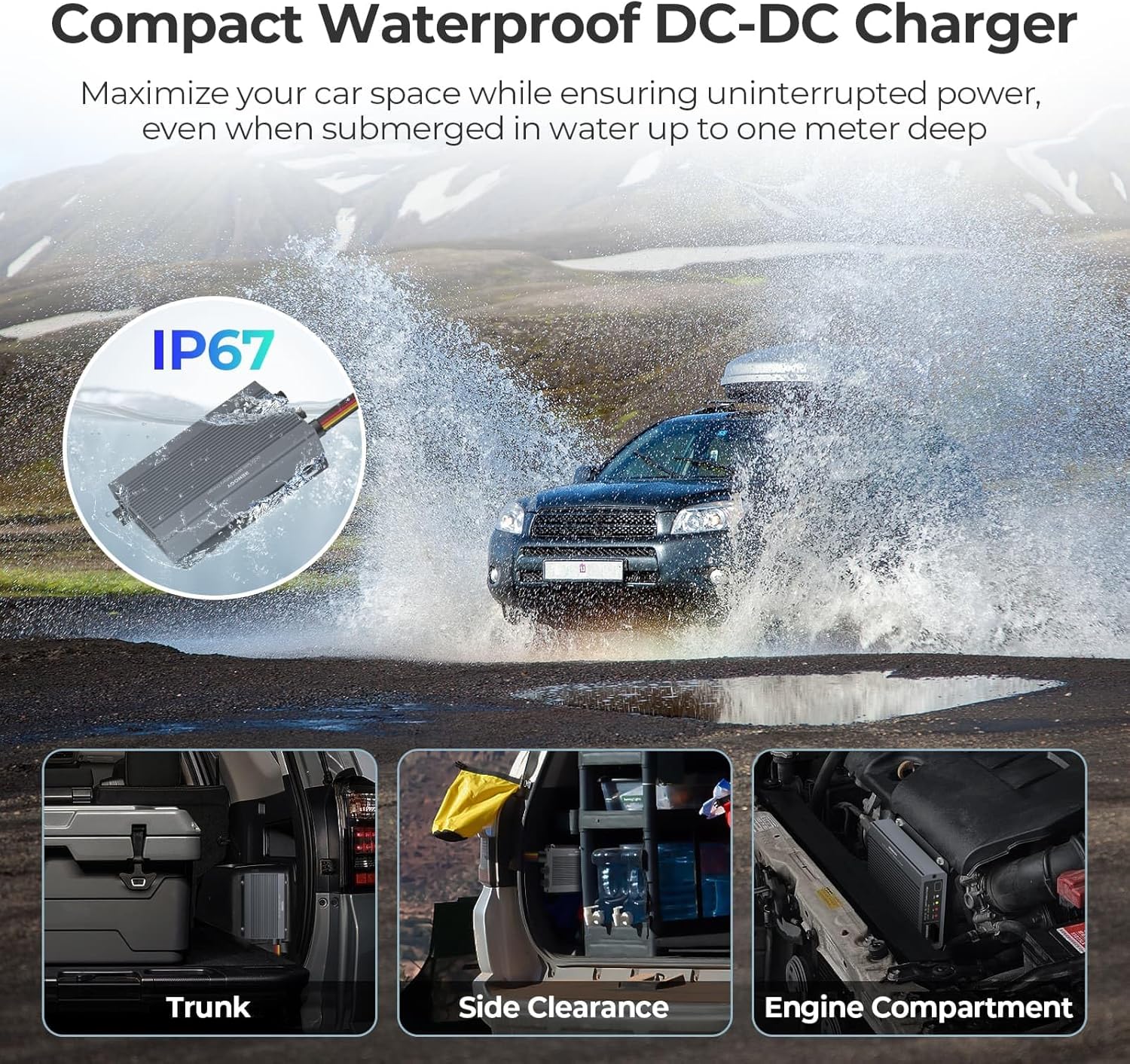 - 𝐄𝐱𝐭𝐫𝐞𝐦𝐞 𝐄𝐧𝐯𝐢𝐫𝐨𝐧𝐦𝐞𝐧𝐭 𝐑𝐞𝐚𝐝𝐲 & 𝐈𝐏𝟔𝟕 𝐖𝐚𝐭𝐞𝐫𝐩𝐫𝐨𝐨𝐟- Built for harsh conditions. This robust DC-DC On-Board Battery Charger operates flawlessly from -31°F to 176°F, delivering full 720W power even at 131°F. Its 𝐜𝐨𝐦𝐩𝐚𝐜𝐭 𝐬𝐢𝐳𝐞 (7"x4.8"x1.5") and crucial IP67 𝐰𝐚𝐭𝐞𝐫𝐩𝐫𝐨𝐨𝐟 & 𝐝𝐮𝐬𝐭𝐩𝐫𝐨𝐨𝐟 rating ensure reliable, protected performance in wet, muddy, or dusty RV engine bays or off-grid adventures.