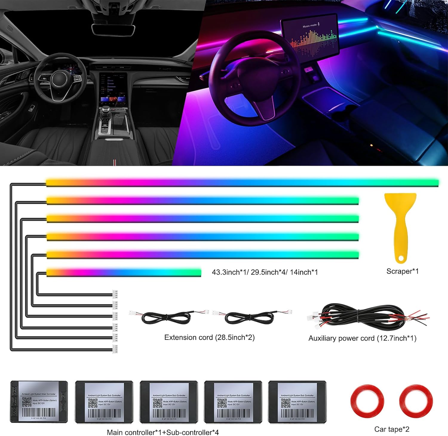 - 【High Bright & Uniform】The Dream+color Acrylic Car Ambient Interior Lighting have super bright LED and acrylic lens and contains 6 LED strips (4*29.5inch+1*43.3inch+1*14inch), also comes with 1 main controller and 4 sub controllers,and can be flexibly installed on any car by DIY without disorganized, which is plug and play, and this acrylic light evenly spread over the lamp strip is brighter, more uniform and softer than other optical fiber lamps that rely on only one LED.