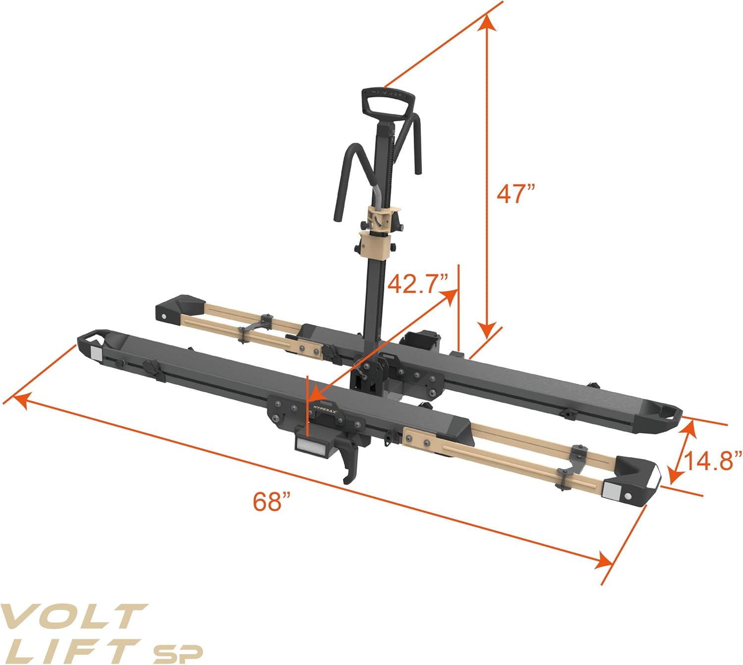 - Maximum Capacity and Protection: With a capacity to carry up to TWO e Bikes with weighing up to 80 pounds and having a wheelbase of up to 48 inches, the Volt LIFT SP is perfect for your adventures. The rack provides ample space for heavy e-Bikes with wheels of up to 5 inches in width. We take your e Bike's safety seriously, so each bike is secured with Velcro straps and safety straps during transit.