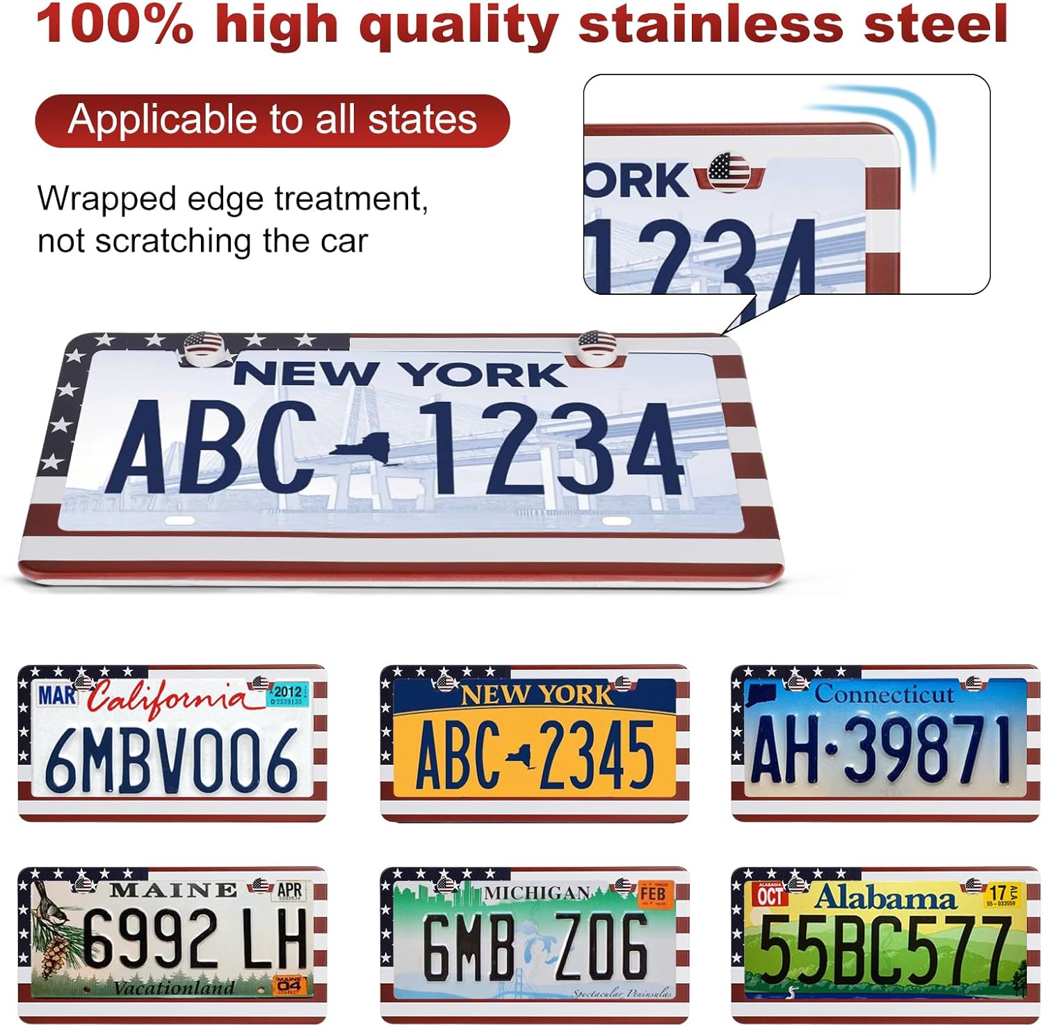 - STAINLESS STEEL LICENSE PLATE FRAME: The main characteristics are no rust, corrosion resistance, air and steam resistance. Wear-resistant, waterproof, not afraid of high temperature, easy to deal with all kinds of bad weather, avoid light pollution, easy to maintain.
