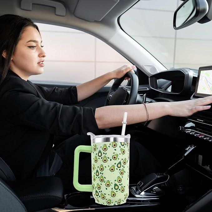 - 40 oz Insulated Tumbler Reusable & Great Quality: Take 40oz Avocado tumbler with you to your favorite studio workout, on your commute, or let it be your desk companion, 40 oz tumbler can be used at home office, family and outdoor parties,beach,camping,swimming pool,and driving,travel and other activities. Very big but with the handle it's easier to carry around. 40 oz cup fits in a standard cup holder. 40 oz water bottle fits in car cup holder.