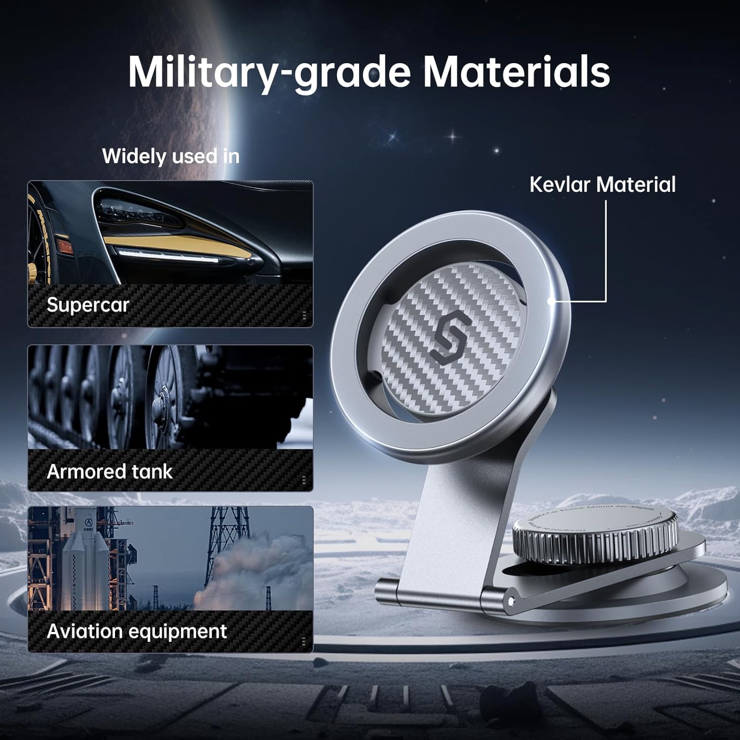 - 【 Protective Kevlar Material】Constructed from Protective Kevlar material, the panel part of this Magnetic car phone holder combines lightweight design with exceptional durability for reliable performance. The Kevlar construction not only ensures strength but also adds a stylish aesthetic to your vehicle's interior. Note: This car phone mount has magnetic feature but it is NOT a charger. It is MagSafe compatible which meets industry standards and provides the convenience and precision of snap-on attachment with a magnetic ring.