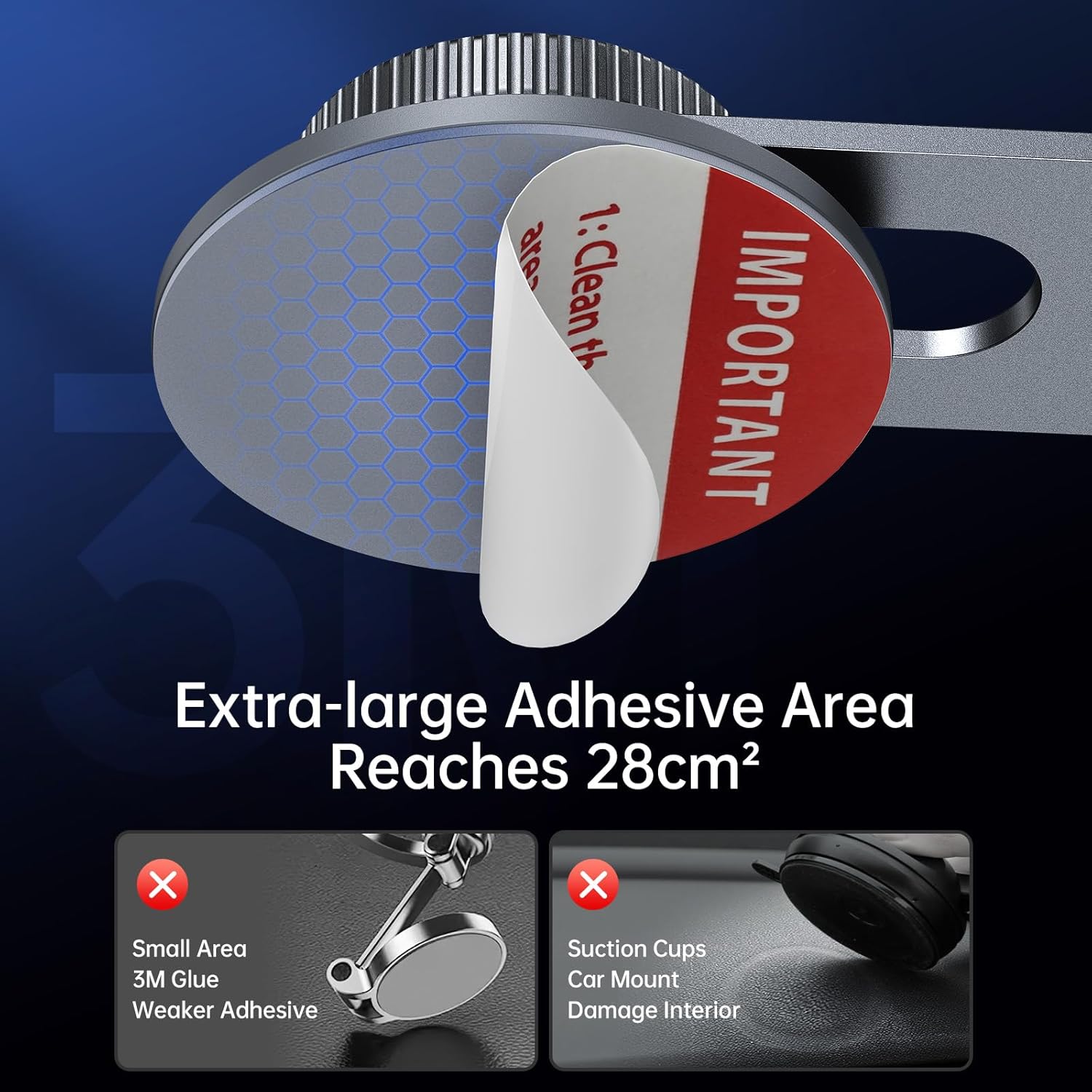 - 【 Extra-large Adhesive Area】3M VHB sticker reaches 28cm², which is 3 times more than other products, making the pasting more stable. It is less likely to damage the interior compared with these traditional suction cup competing products. The traditional suction cups will cause irreversible deformation and damage to the user's dashboard due to vacuum suction.