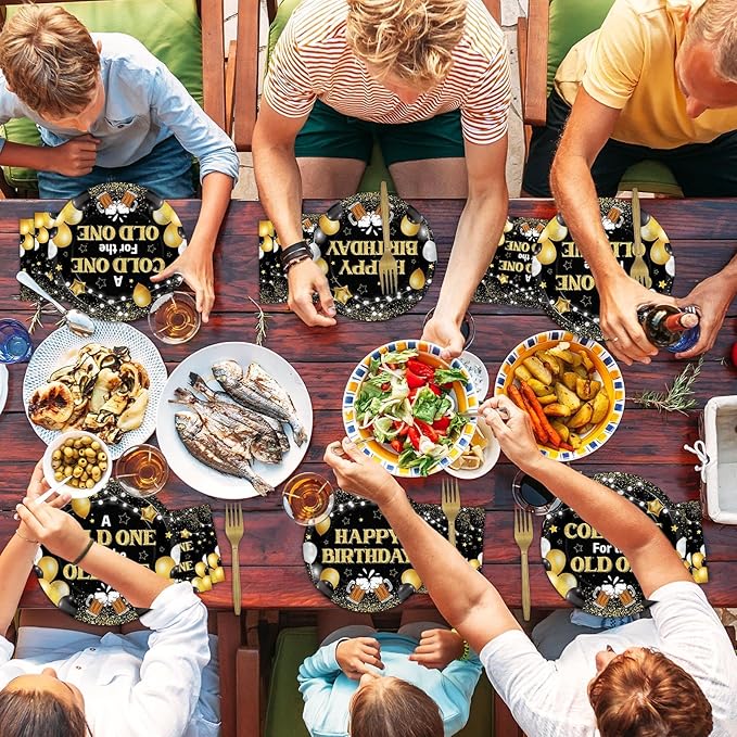 - A cold one for the old design: Design with "A Cold One for The Old One" and "Happy Birthday" prints, alongside black, gold, and silver balloons, twinkling string lights, and dazzling gold confetti, this a cold one for the old one tableware set will bring you a memorable and meaningful party.