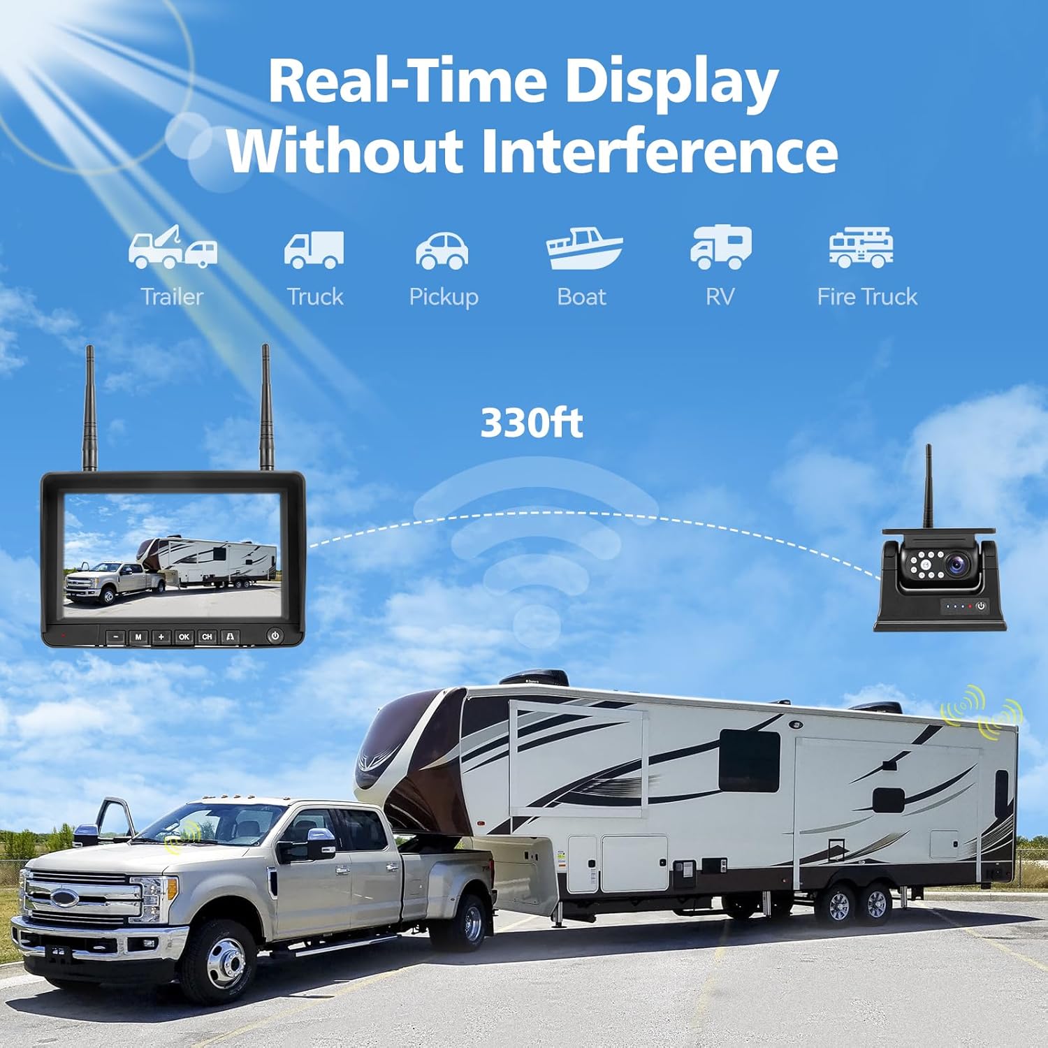 - 【Dual Antenna & Digital Stable Signal】 Built-in strong signal booster receiver for fast and stable transmission, no more image freezing, and the transmission distance can reach 330 feet (without obstacles), and 50ft on vehicle for reversing or 36ft on vehicle for continuously use, which is long enough for most vehicles, like Trucks, Pickups, Camper, SUVs, Trailers, and Motorhome.