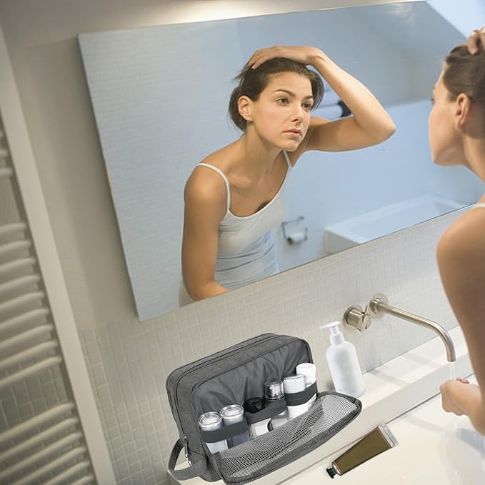 - 【ORGANIZED COMPARTMENTS】 --- Main compartment that holds larger items such as shampoo bottles or shaving cream. One zippered mesh pouch that keeps your smaller toiletries and cosmetics in a place visible and breathable. Other side front zipper pocket that provides extra storage with easy.