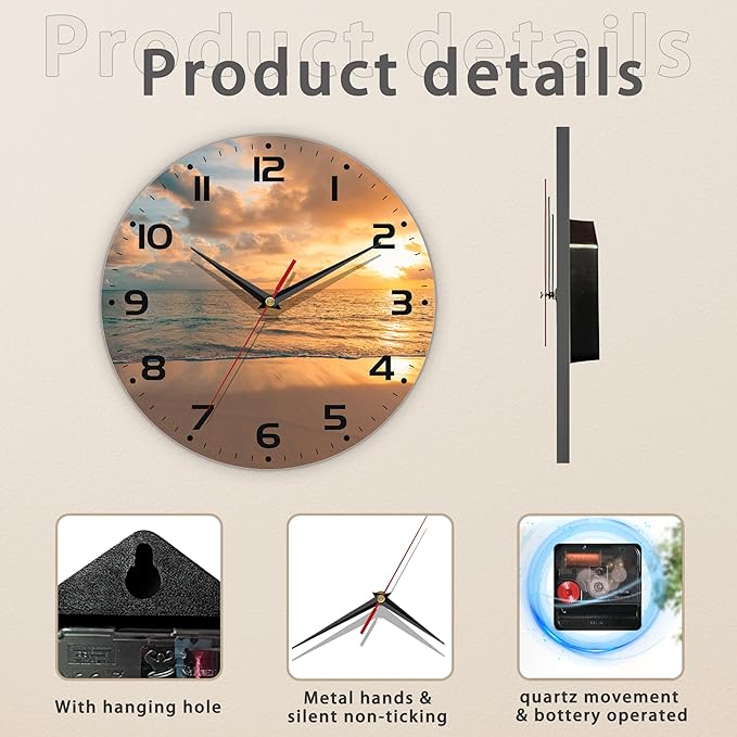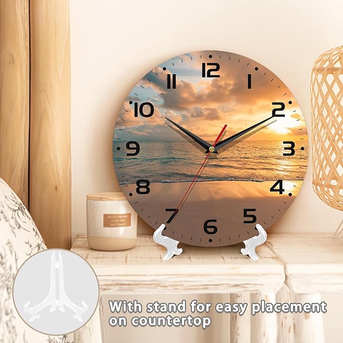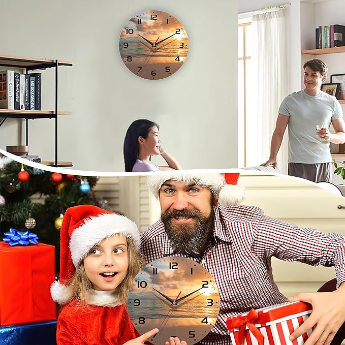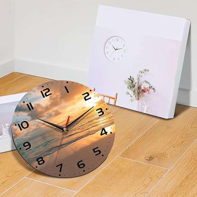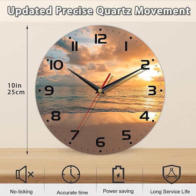 Sunset Beach Wall Clock - Vintage Wooden, Silent Non-Ticking, Battery Operated, Arabic Numerals, Decorative for Kitchen, Office, Classroom - 10 Inch