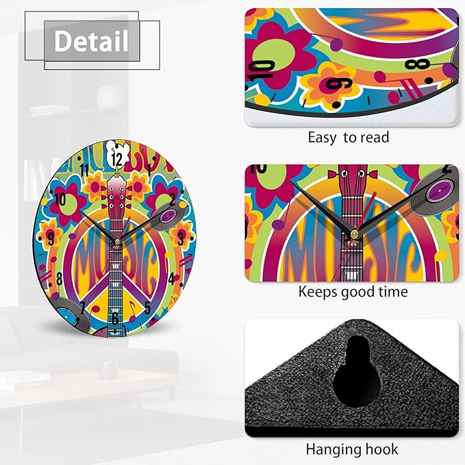 SPUNKER Clock for Bedroom,Music Guitar Kitchen Wall Clock,Peace Symbol Dove Clocks 10 Inch Silent Non-Ticking Wall Battery Operated for Living Room Bedroom Bathroom Laundry Room Decor