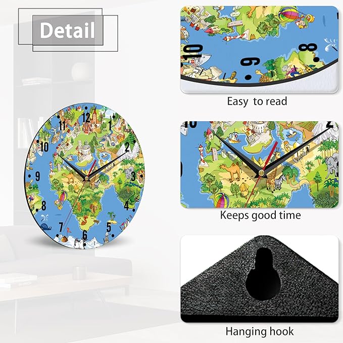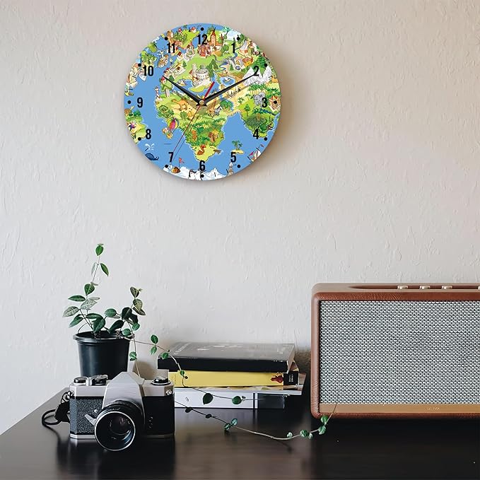 SPUNKER Wall Clock,Animals World Map Kitchen Wall Clock,Cute Landmarks Clocks 10 Inch Silent Non-Ticking Wall Battery Operated for Living Room Bedroom Bathroom Laundry Room Decor