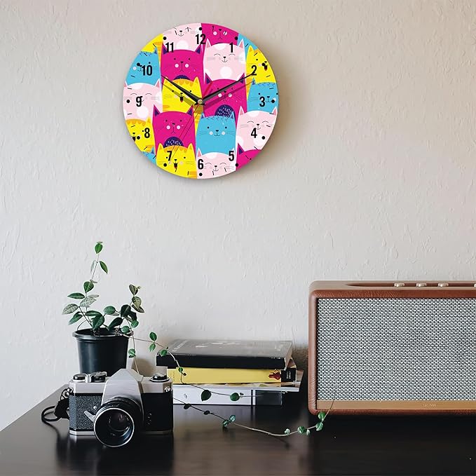 SPUNKER Wall Clocks,Cute Cats Wall Clocks for Living Room Decor,Colorful Kitten Kitchen Clocks Wall Battery Operated - 10 Inch Round Bathroom Wall Clock Silent Non-Ticking