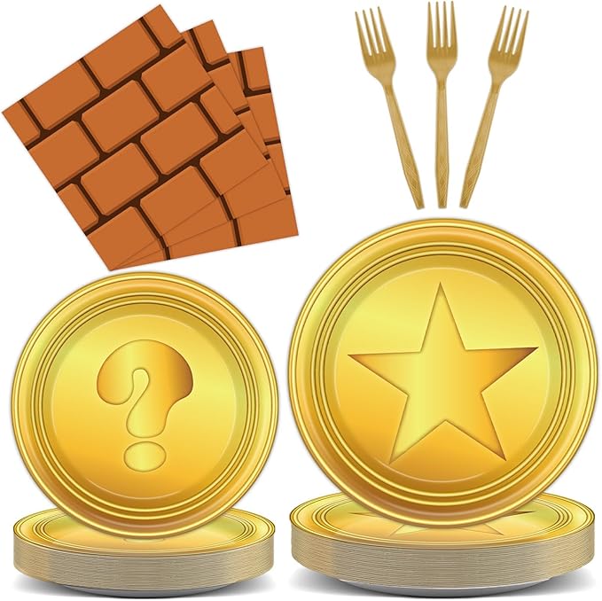- Game theme design: Channeling the spirit of classic games, our game theme party tableware set features plates adorned with vibrant gold coins and instantly recognizable wall obstacles. Embark on a nostalgic journey filled with excitement and memories. Ideal for game enthusiasts and those who appreciate the thrill of retro gaming.