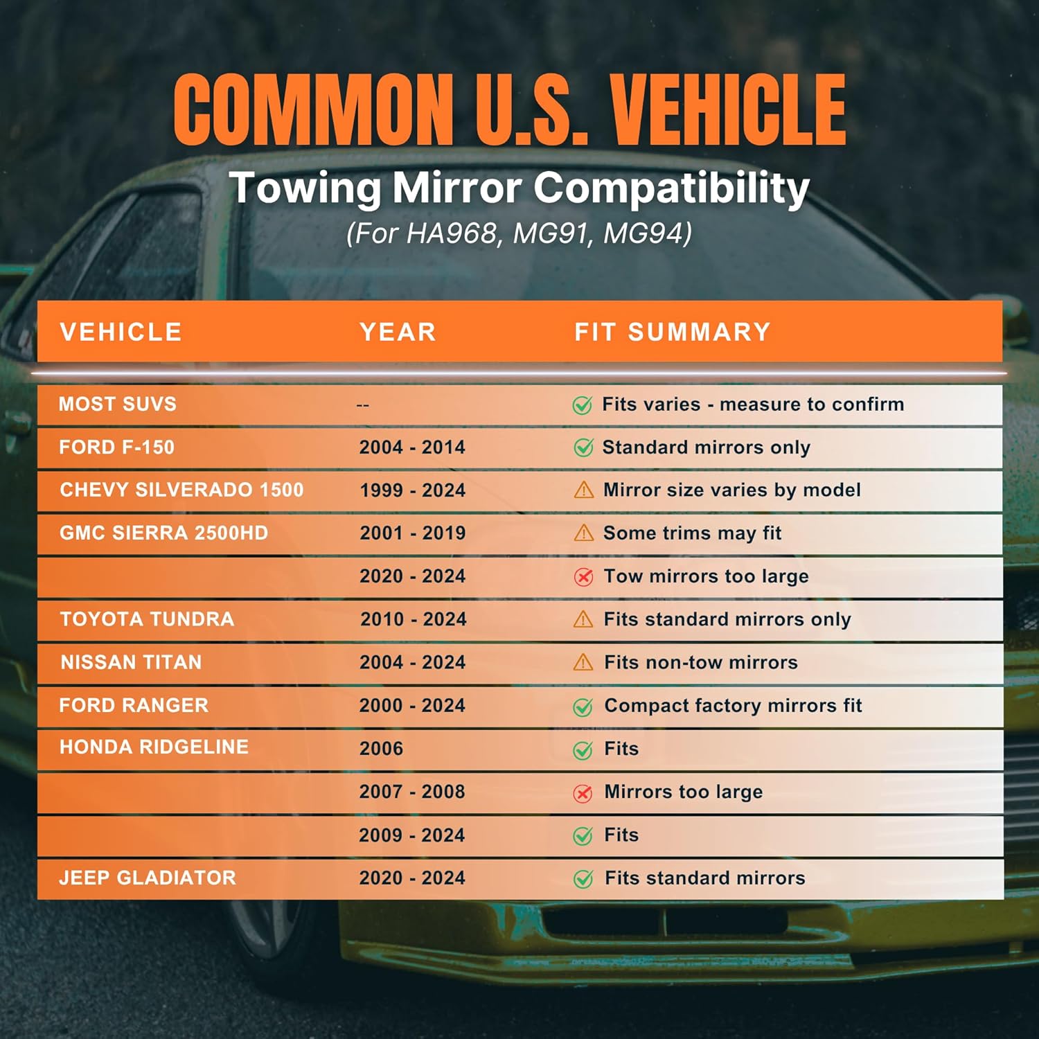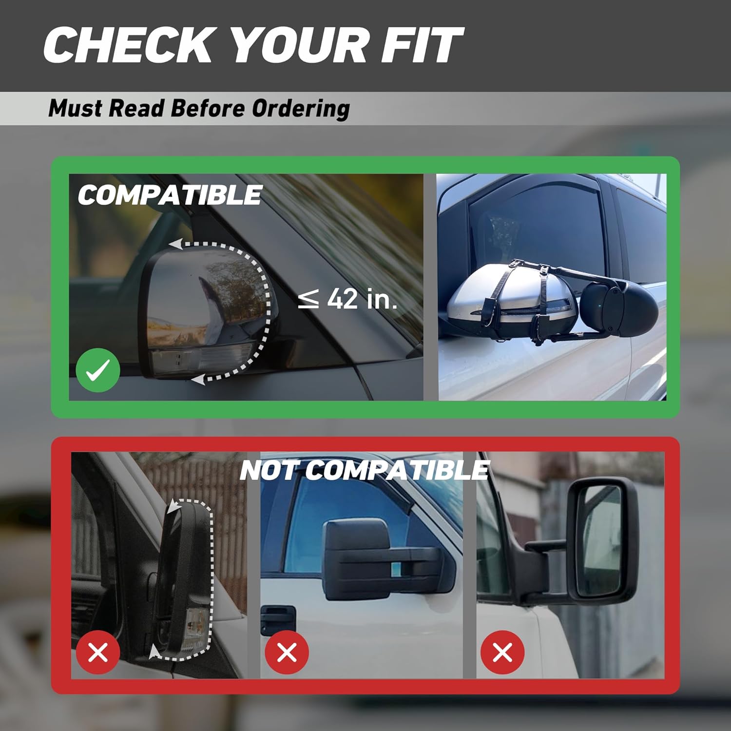- Fits Most Standard Mirrors - Compatible with most standard side mirrors on pickups, SUVs, and RVs; NOT suitable for vertical-style mirrors or mirrors exceeding 42 inches in perimeter.