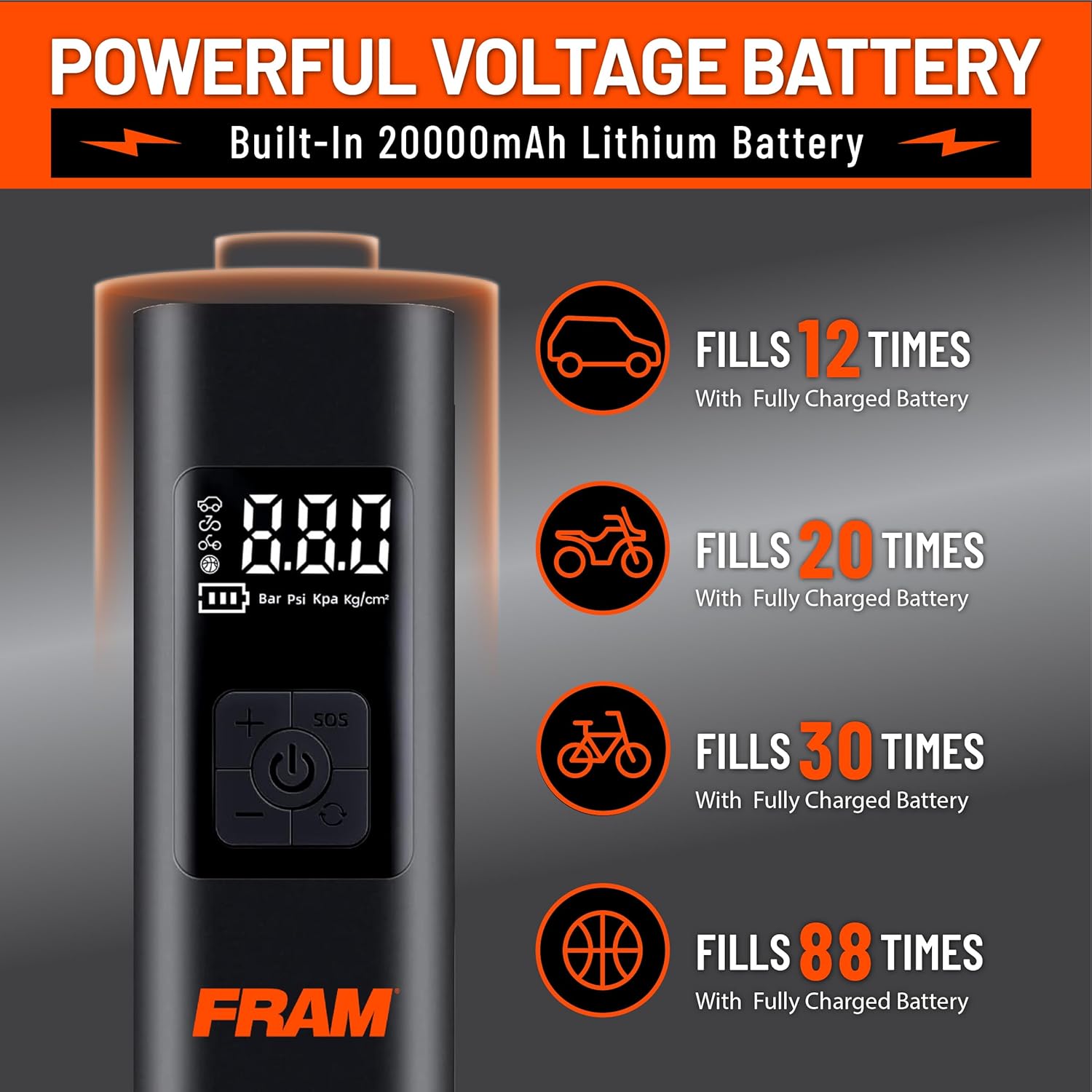 - 4 MODE AIR PUMP: The FRAM portable tire inflatoroffers diverse pressure units, such as PSI, BAR, KPA, KG/CM², you can easily select the best option for you. This cordless, digital display, electric inflator also has 4 modes, with 5 different attachments for each mode, and a large battery capacity that won’t let you down.