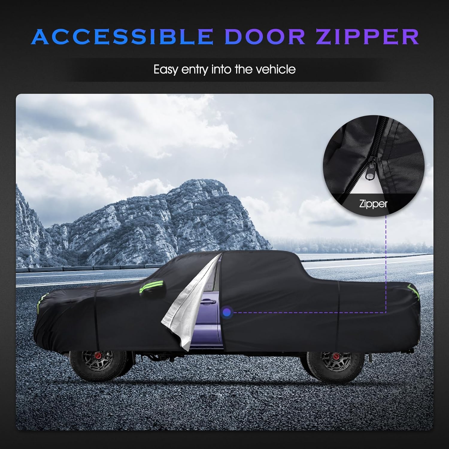 - 【6 Layers Protection】: The Qualencey Truck cover features a multi-layer composite material design : PA Coating - PE - Aluminun - PE - PE - VA - Soft Cotton,which can withstands summer sun exposure and winter rain/snow;The streamlined design and superior craftsmanship protect your car's painting;For truck covers waterproof 4 doors are engineered to be Sturdy, colorfast, UV resistant, and water resistant to keep your car dry and warm in all seasons, for outdoor and indoor protection
