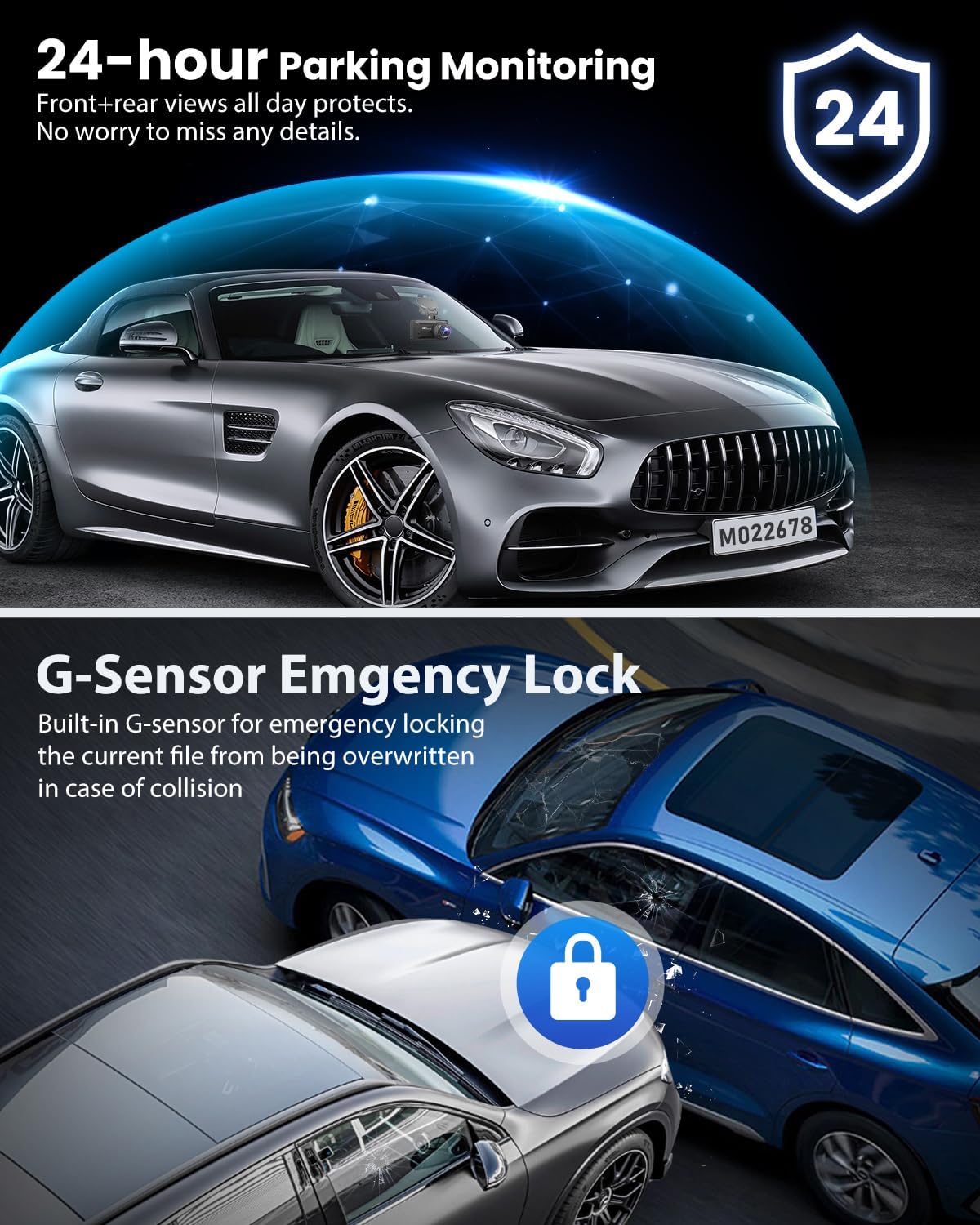 - ADVANCED FRONT AND REAR DASH CAM: This car dash cam with G-SENSOR, once the car suddenly collides, car camera will record and lock the video of the collision. 24-hour parking monitoring: The dash camera can record continuously for 24 hours (Internal battery supply urgent use, need to purchase additional hardware)