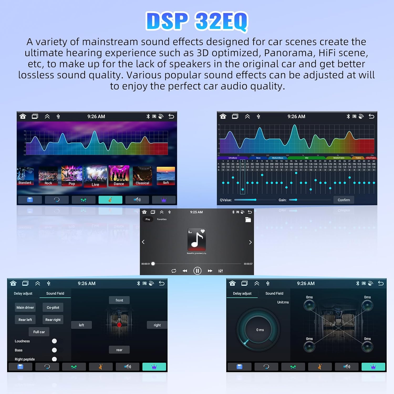 - 【DSP 32EQ 】A variety of mainstream sound effects designed for car scenes create the ultimate hearing experience such as 3D optimized, Panorama, HiFi scene, etc, to make up for the lack of speakers in the original car and get better lossless sound quality. Various popular sound effects can be adjusted at will to enjoy the perfect car audio quality.