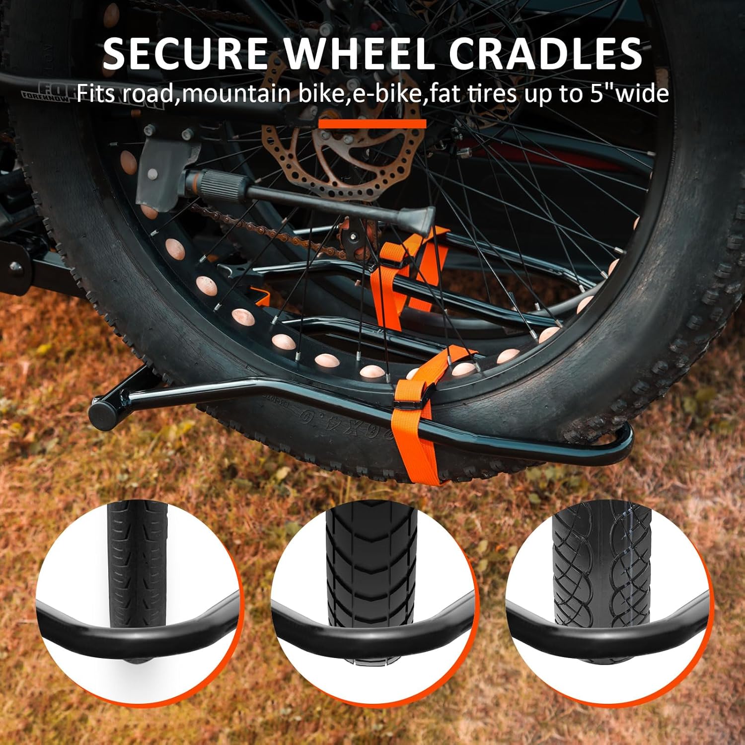- 🚴【HEAVY-DUTY CONSTURCTION】: Built with high-strength alloy steel to support up to 180 lbs, accommodating two bikes of various sizes and types, including eBikes, mountain bikes, and road bikes.
