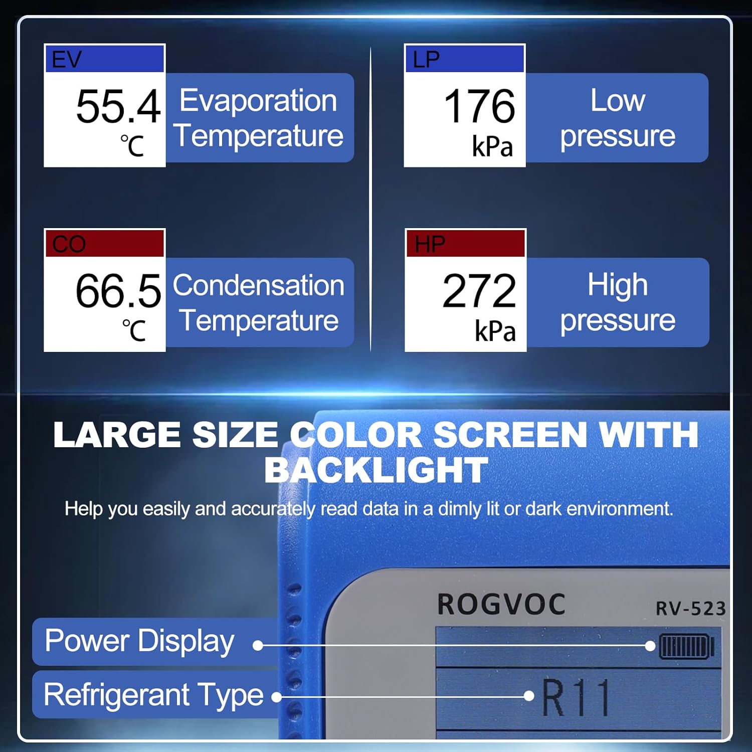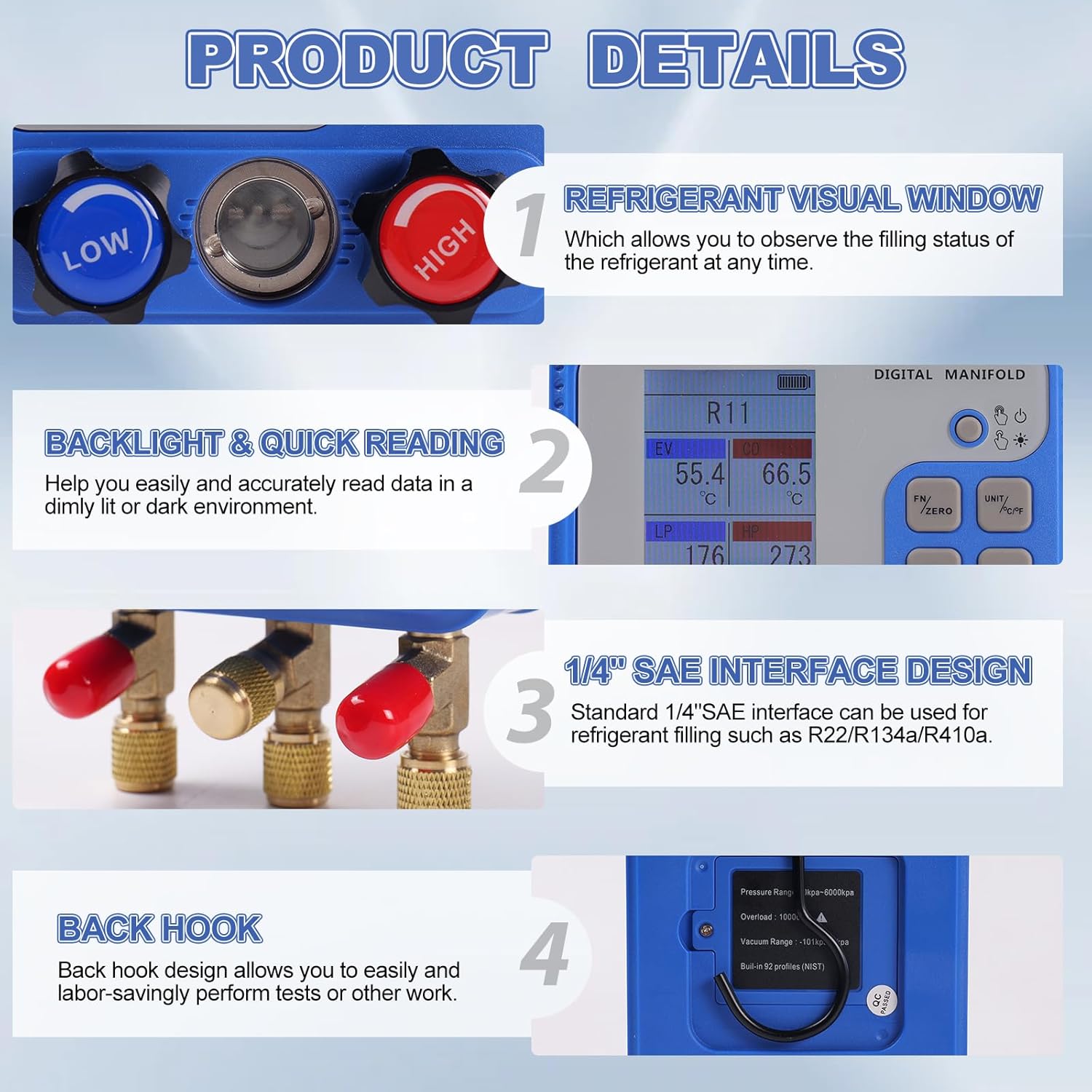 - CONVENIENCE DESIGN: The refrigeration digital gauges adopts a visual window design, which allows you to observe the filling status of the refrigerant at any time; gauges system multiple built-in pressure units and temperature units for free switching; the TFT LCD display can help you easily read data in a dimly lit or dark environment; back hook design allows you to easily and labor-savingly perform tests or other work