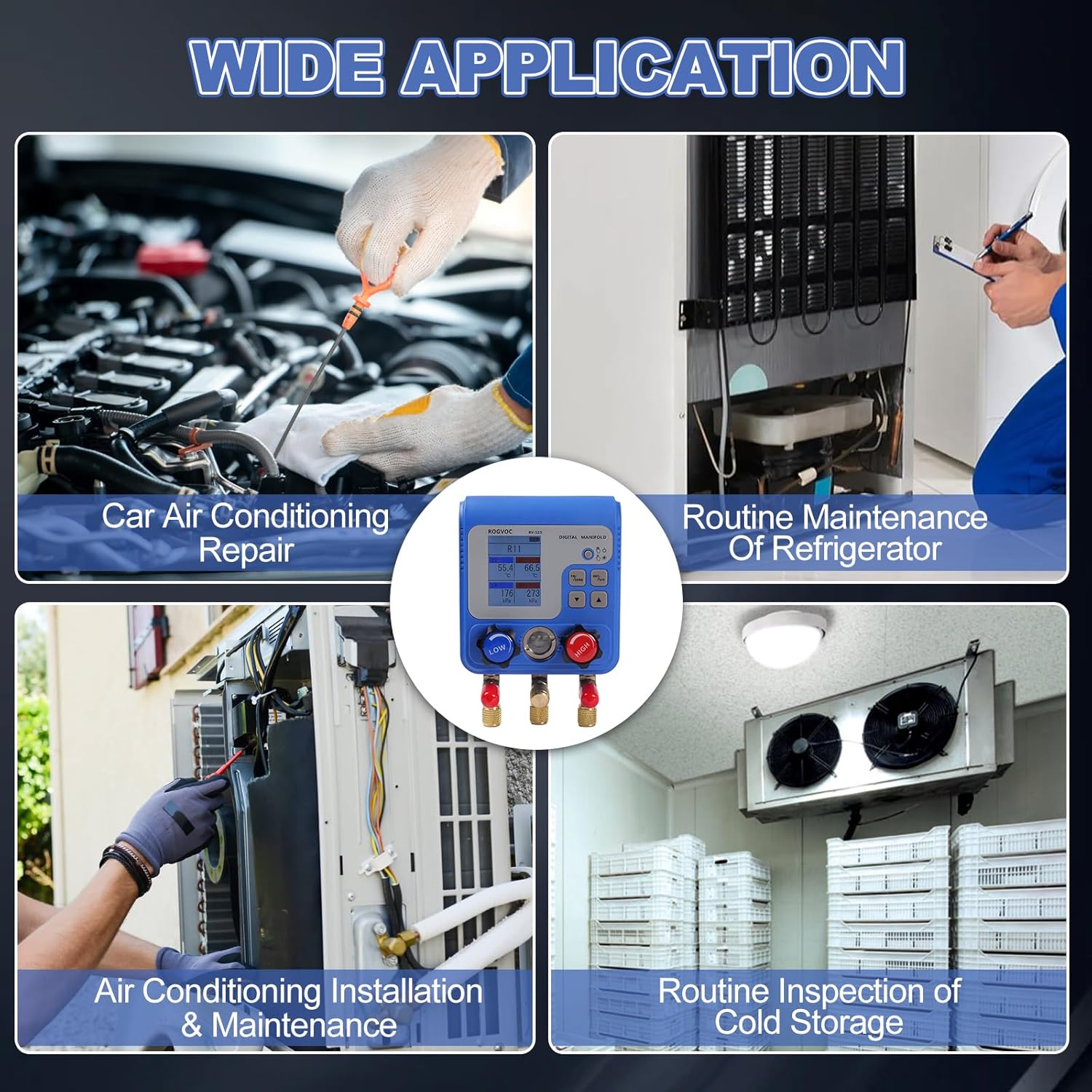 - DIGITAL MANIFOLD GAUGE SET: Rogvoc manifold gauges have functions such as refrigerant filling, pressure and air tightness test, vacuuming, etc. Built-in 92 types of refrigerant data can be switched or filled with different types of refrigerants according to needs. The 32-bit digital precision data acquisition unit has good data stability, making the pressure data measurement more stable and accurate