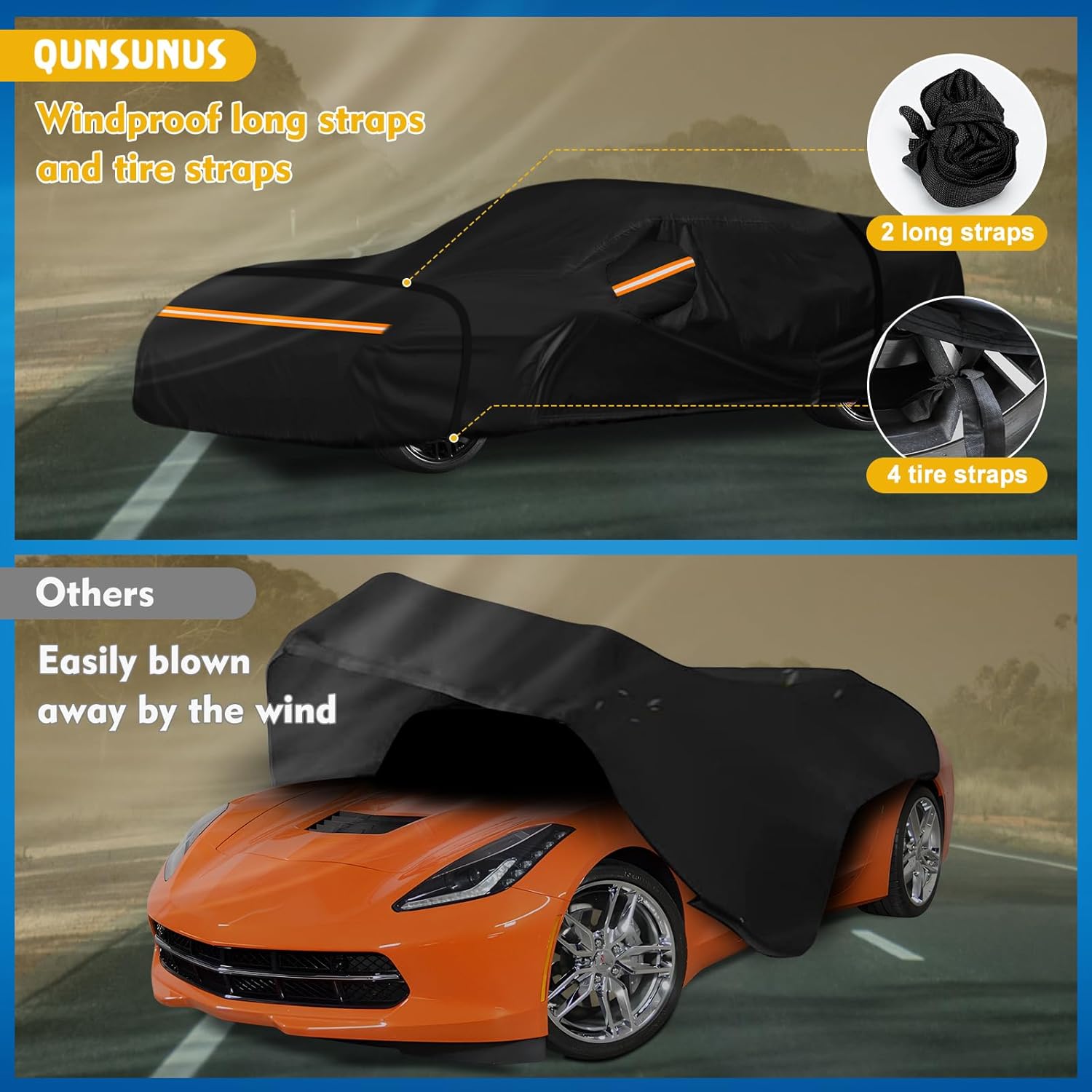 - 【Windproof Upgrade】1.There are four tire straps to keep the car rain cover secured in place.2. Buckle the windproof buckle that goes through the bottom of the car.3. Elastic hems on the front and back end for a better fit on your car.4. Two complimentary extra-long windproof straps can be strapped to your car's hood and rear.