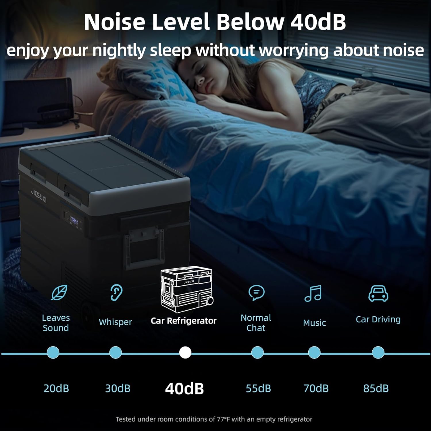 - Portable Design and Anti-Shaking: 12v car refrigerator is equipped with sturdy wheels and ergonomic trolley bar, removable 2 doors, USB slot, drainage holes, these features configurations to help you reduce the burden, so that you can enjoy convenient and comfortable travel, at the same time, our JicSuXi refrigerator is equipped with advanced anti-vibration technology for uneven cross-country roads, the car refrigerator will still operate stably even when the road is tilted to an extreme angle of 30°!