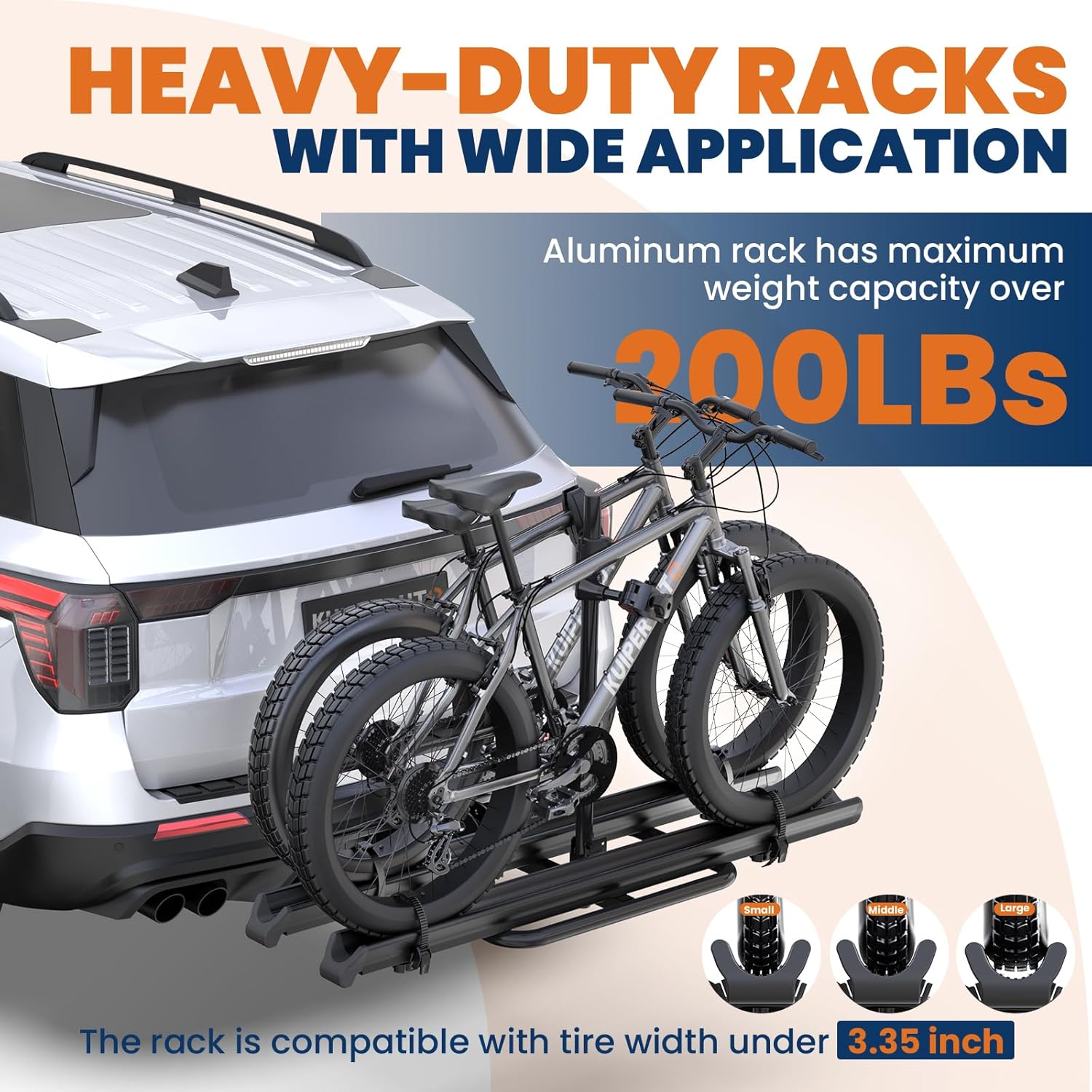 - Wider Application w/ Superior Material : The rack compatible with bike’s tires up to 3.35 inches wide and bike wheelbases up to 53 inches. Good option fit for e-bikes, mountain bikes, road bikes, children's bikes, standard, fat tire, electric bicycles and BMX bikes. Adopted heavy-duty steel and aluminum with e-coating to ensure better anti-corrosion, anti-scratching for longer durability.
