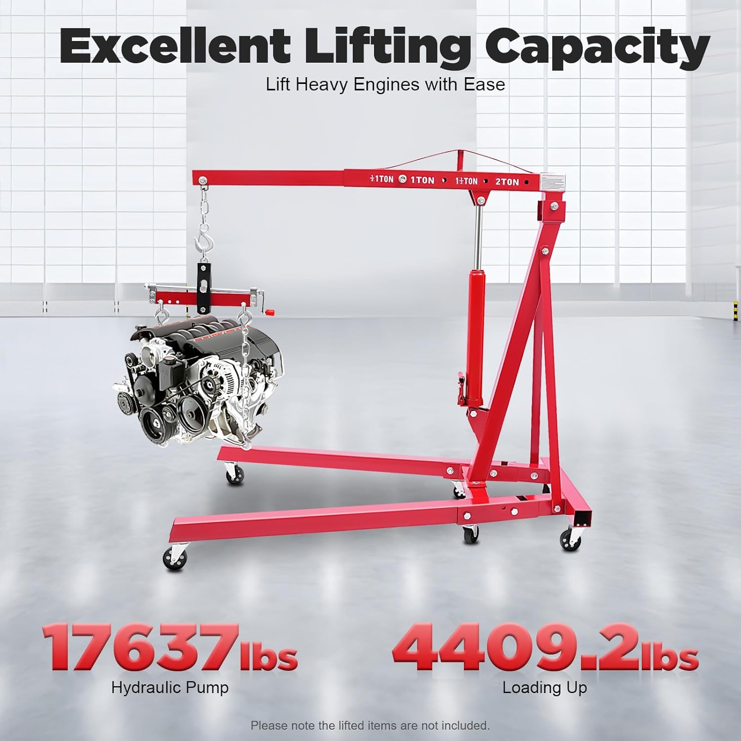 - Heavy Lifting Engine Crane: Hydraulic engine hoist has a weight capacity of up to 2T/ 4400 lbs, making it versatile enough to handle a variety of lifting tasks. The hoist can be adjusted to four levels(1102lbs, 2204lbs, 3306lbs, 4409lbs), allowing for easy lifting of different weights. the 17637 lbs hydraulic pump ensures long-term use, improving your work efficiency. This carbon steel folding engine hoist can be an excellent assistant in car repairs.