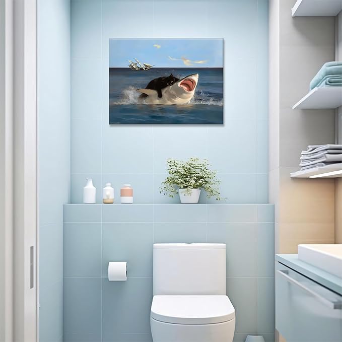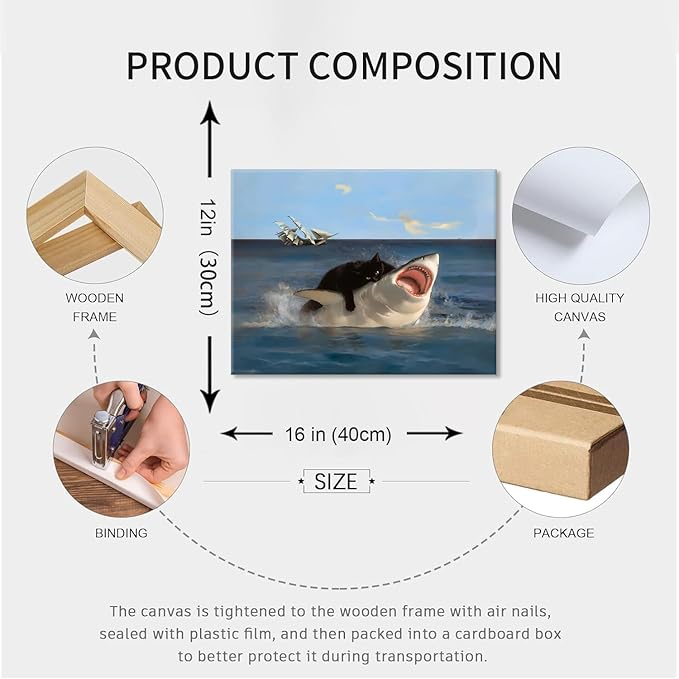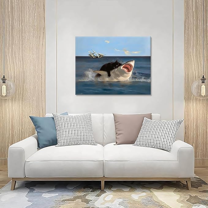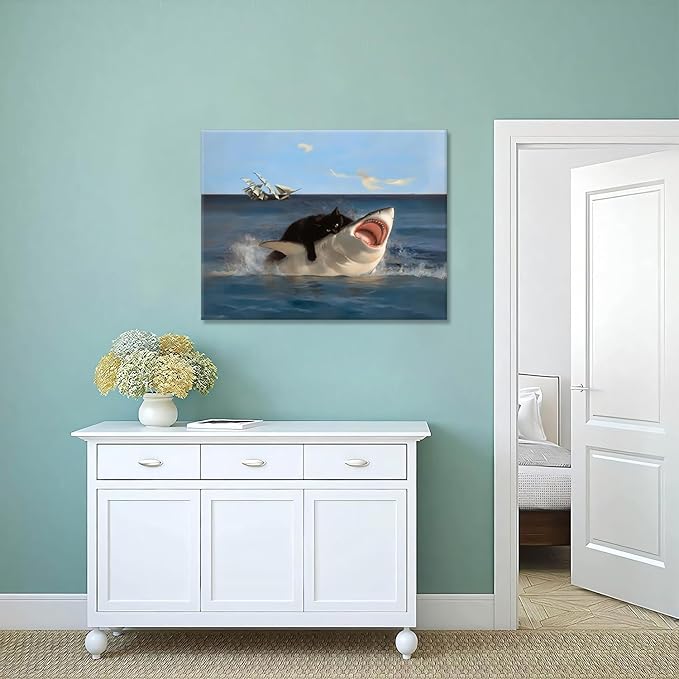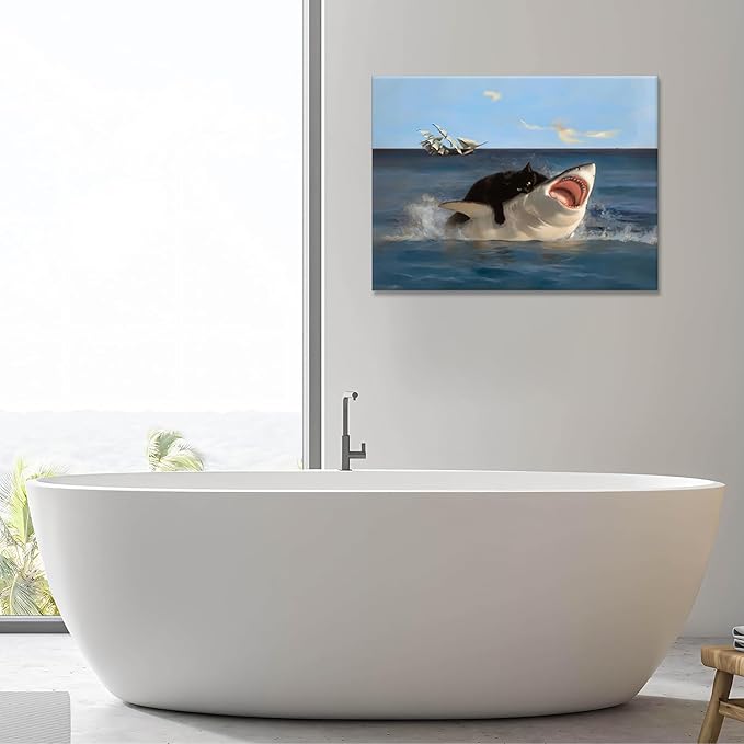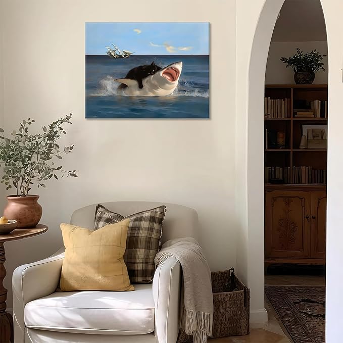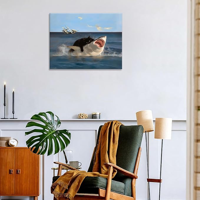 - 【Versatile Room Decor】:These cat and shark canvas prints are perfect for a variety of spaces, including bedrooms, living rooms, bathrooms, and any other room that could use a fun and quirky touch. The 12x16 inch size makes them easy to incorporate into any decor scheme, whether displayed individually or as a set. These cat wall art and shark wall art pieces will enhance the aesthetic of any room.