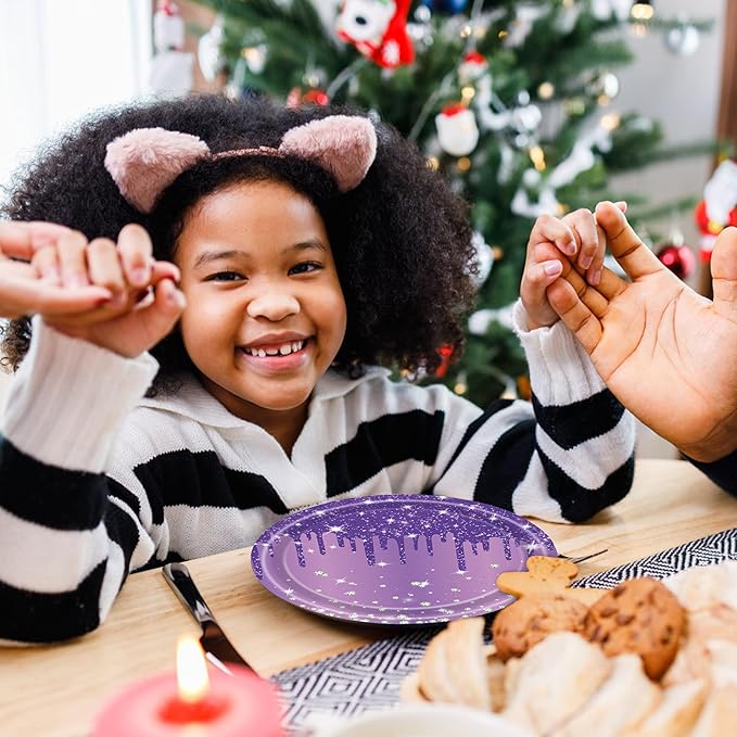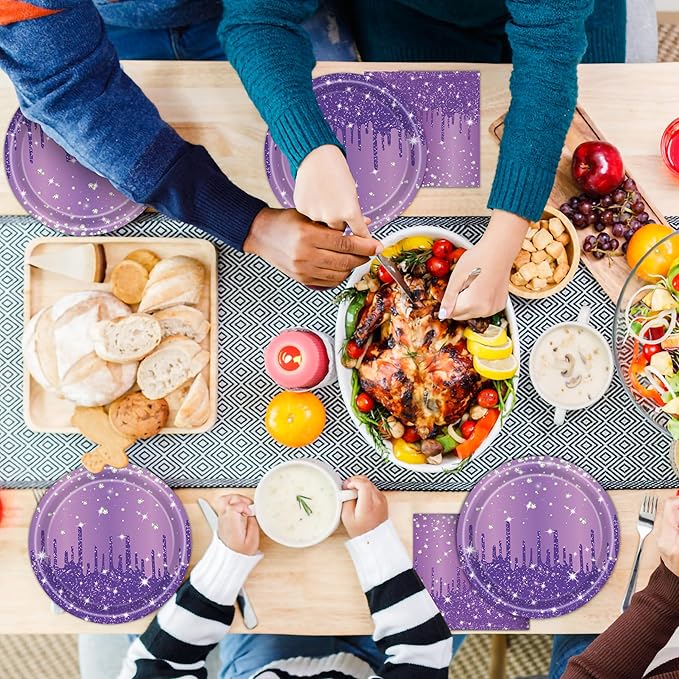- 【Purple Silver Paper Plates】This purple silver tableware set party supplies set includes: 24 plates (7inch) + 24 plates (9inch) + 24 napkins (13inch) + 24 forks, making a total of 96 pieces. Each set can serve 24 guests, you don't need to spend extra time to choose, and you will spend more time enjoy your party!