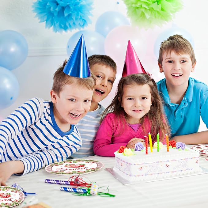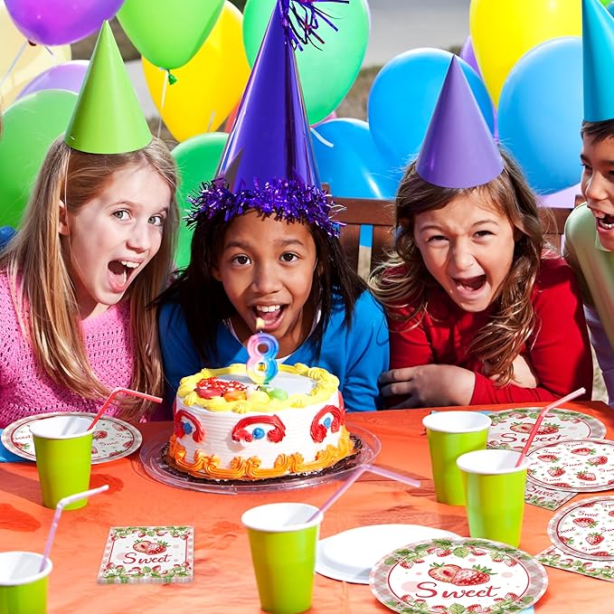 - 【Efficient and Save Time】These strawberry themed birthday party decorations are an ideal replacement for traditional parties plates. The plates and napkins are disposable, saving you cleaning time after the party. After the party, you can spend more time with your family or friends and less time cleaning up.