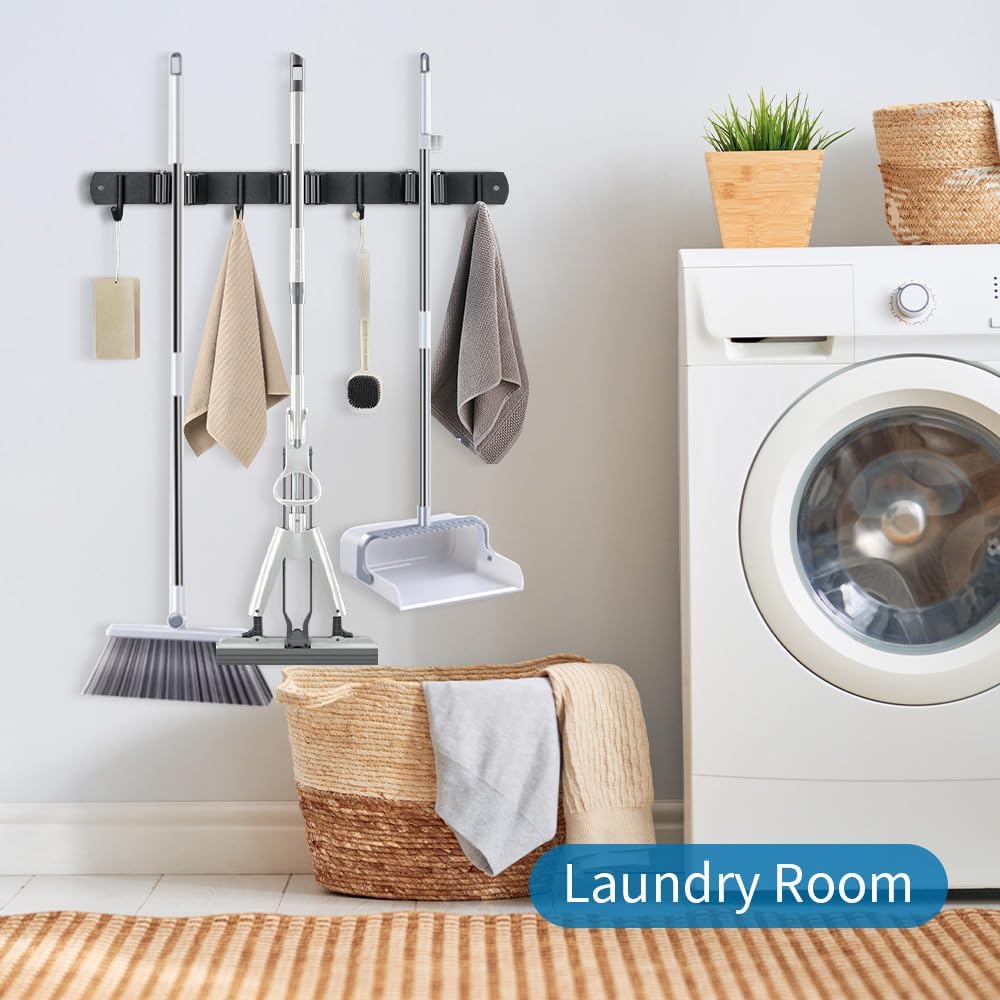 - 🏠【HIGH CAPACITY】: Each broom organizer wall mount has 4 rubber roller clips and 5 hooks, there are total 9 positions for mops, brooms, duster, shovels etc. Push them into the clamps with easy after finish your household cleaning. It can help you utilize your space to the maximized extent and make itmuch easier to store and take objects.