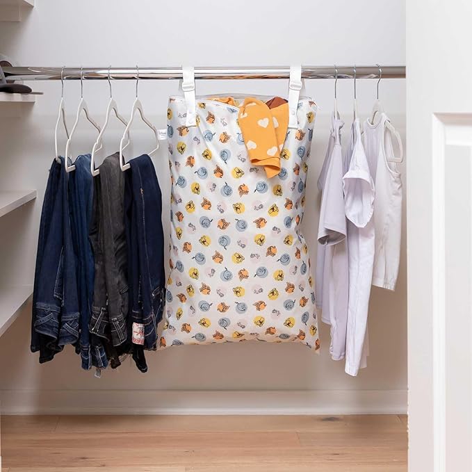 - HANGING WET BAG – Essential for travel and laundry; hang in closet, playroom, nursery or hotel closet rod; pack dirty clothes, tote wet swimsuits, diapers and more; alternative to large hampers, these totes can fold and lay flat when not in use