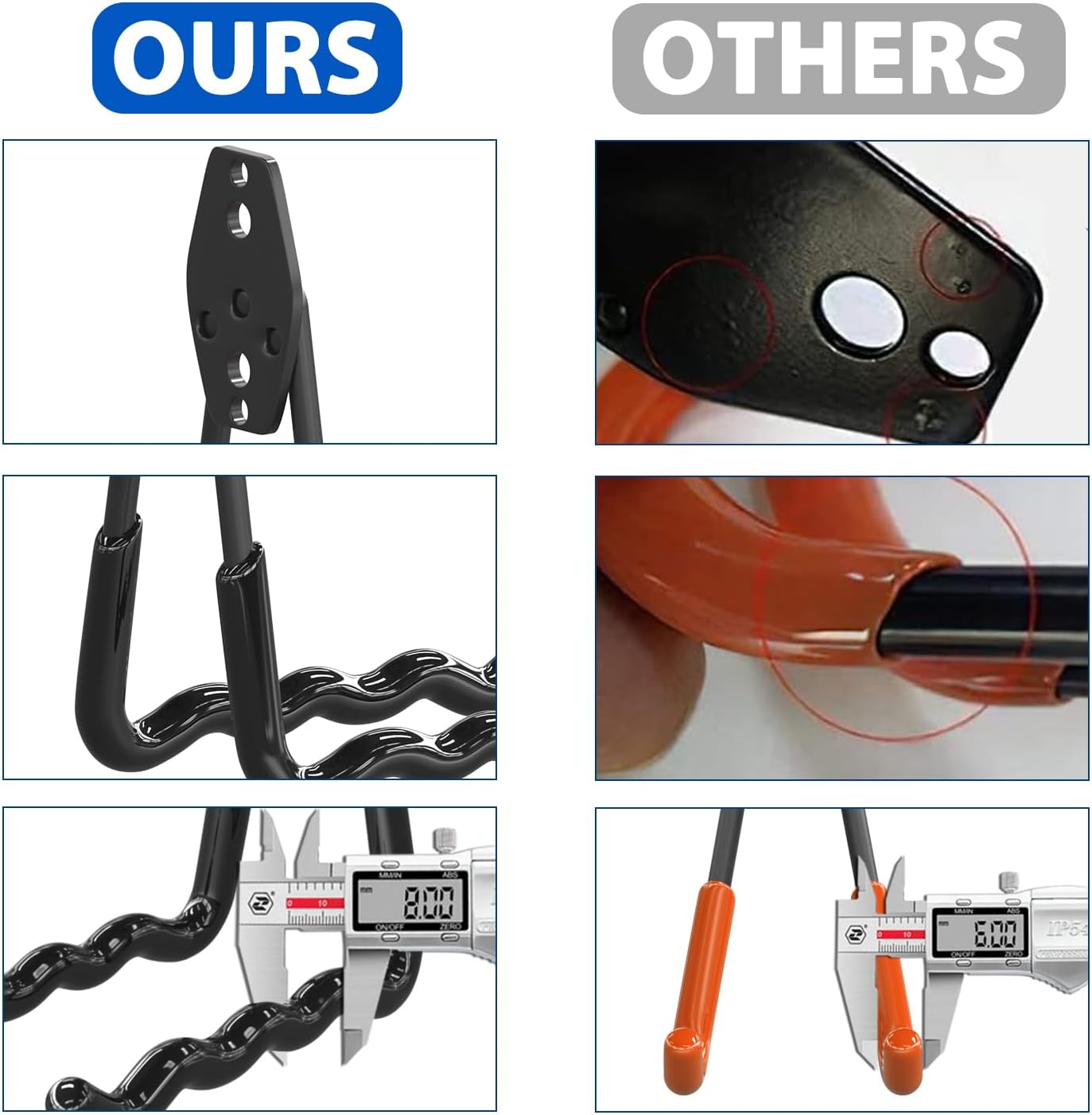 - SUPER STUDY HOOKS:The garage hooks for hanging are made of heavy duty steel metal material, have strong load bearing capacity which enable the garage storage system hooks can hold weight up to 100 lbs. The garage storage hooks are not easy to bend and will last for years. The tubular double hooks design makes ladder hooks for garage more stable than regular single hooks. Solid steel body adopts anti-rust coating and non-slip PVC sheath which gives storage hooks for garage wall better grab.