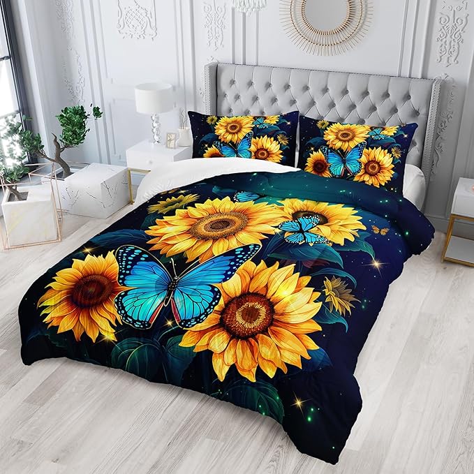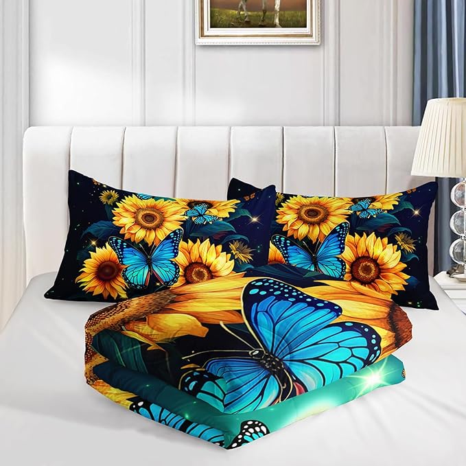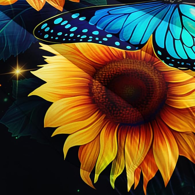 - Unique Design:Blue butterflies are flying on this yellow sunflower plant under the starlight and fireflies. The unique design is simple and elegant, which makes your bedroom more fashionable.