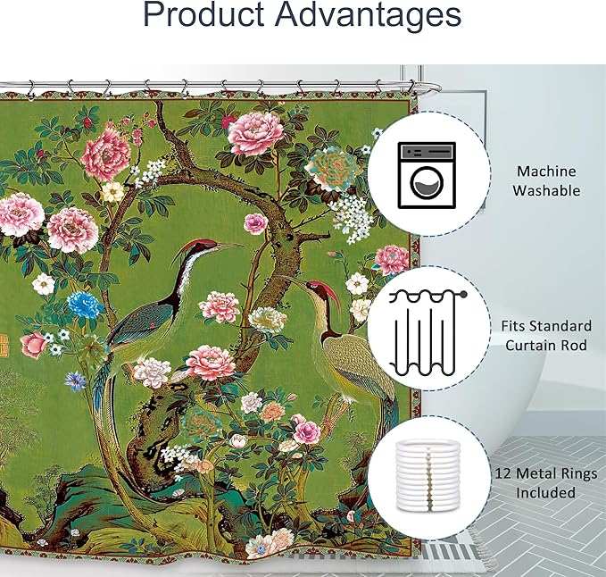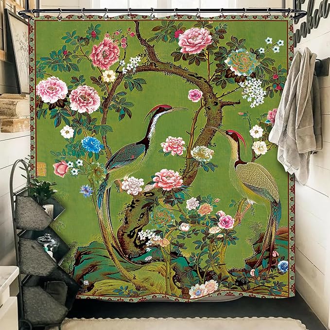 Vintage Flower Shower Curtain 60Wx72L Inch Crane Peony Vintage Retro Chinese Plant Botanical Green Blossom Japanese Art Bathroom Set Accessories Decor with 12 Pack Hooks