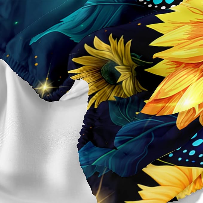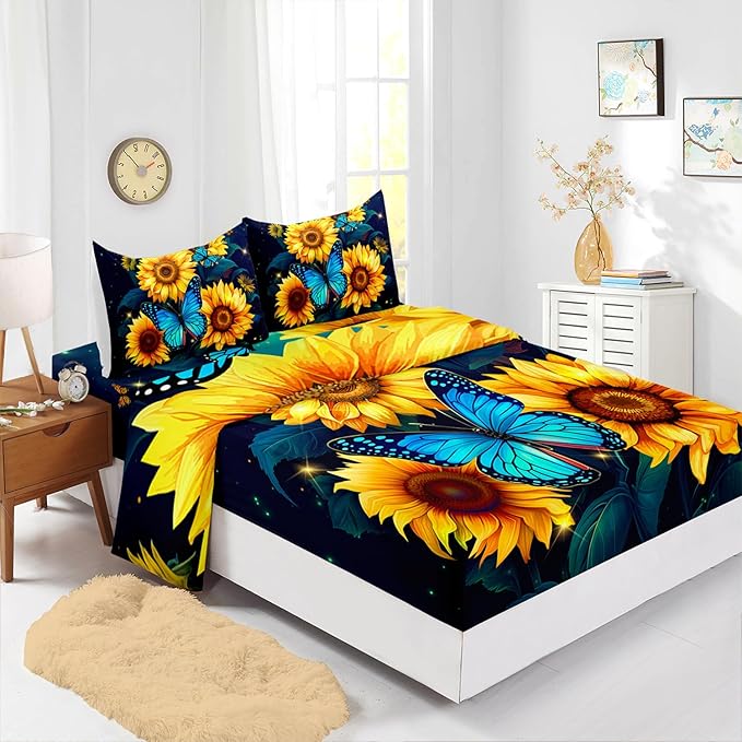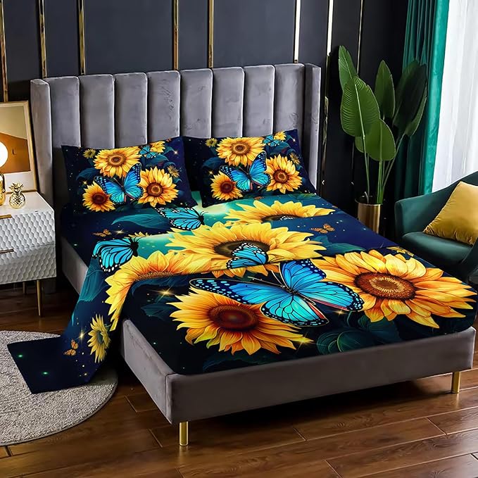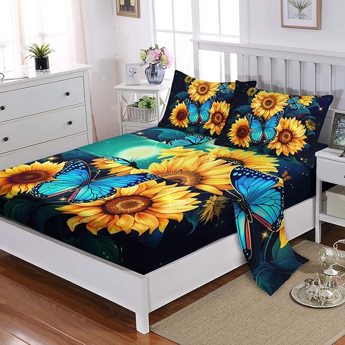 - Unique Design:This fitted sheet is like a picture scroll with blue butterflies dancing on this yellow sunflower under the illumination of starlight and fireflies. The unique design is simple and elegant, which makes your bedroom more fashionable.