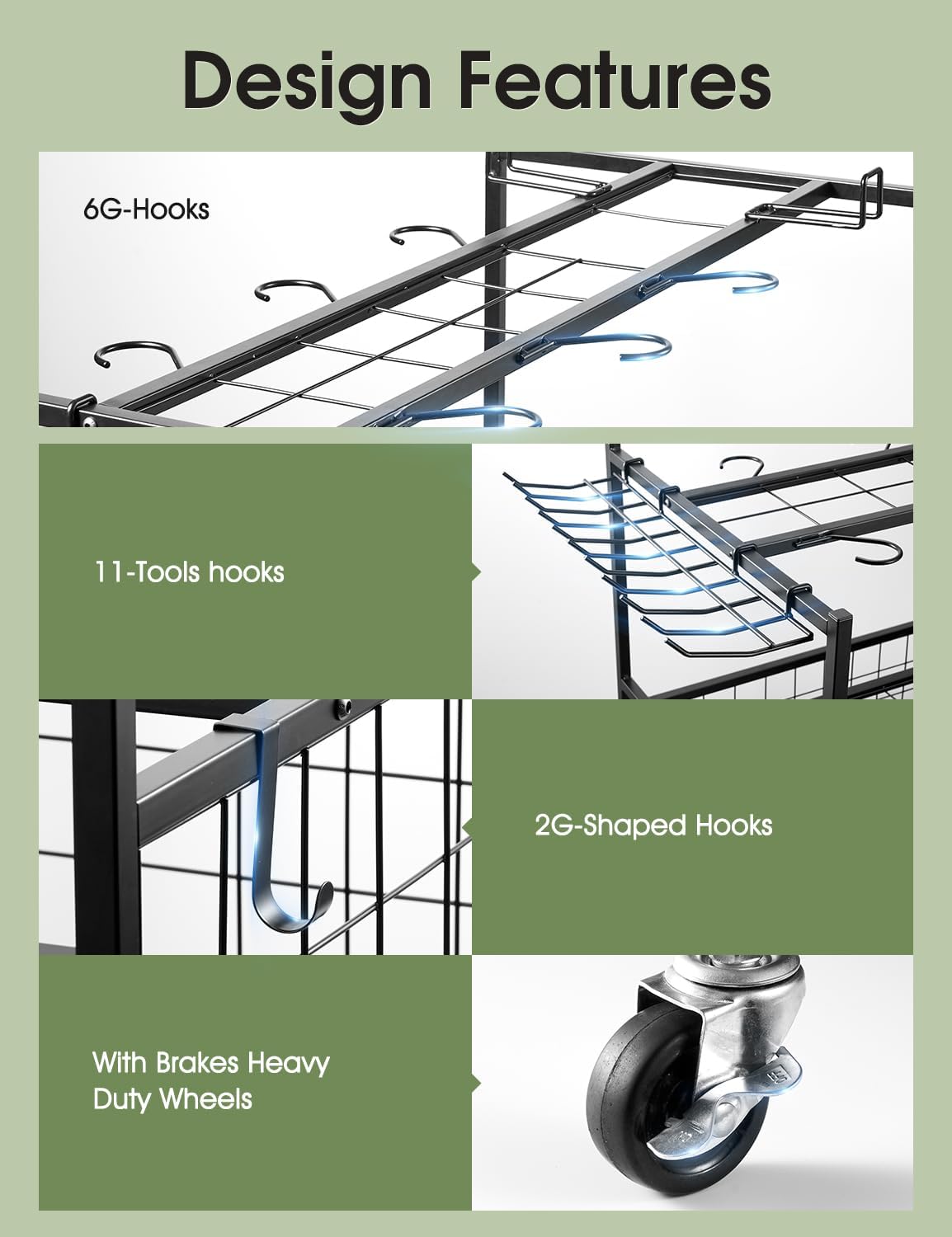 Heavy-Duty Garden Tool Organizer for Garage with 2 Stair-Climbing Wheels, Lawn & Yard Tool Storage Rack, Garage Tool Cart with Lockable Wheels, Outdoor Garden Tool Storage for Sheds