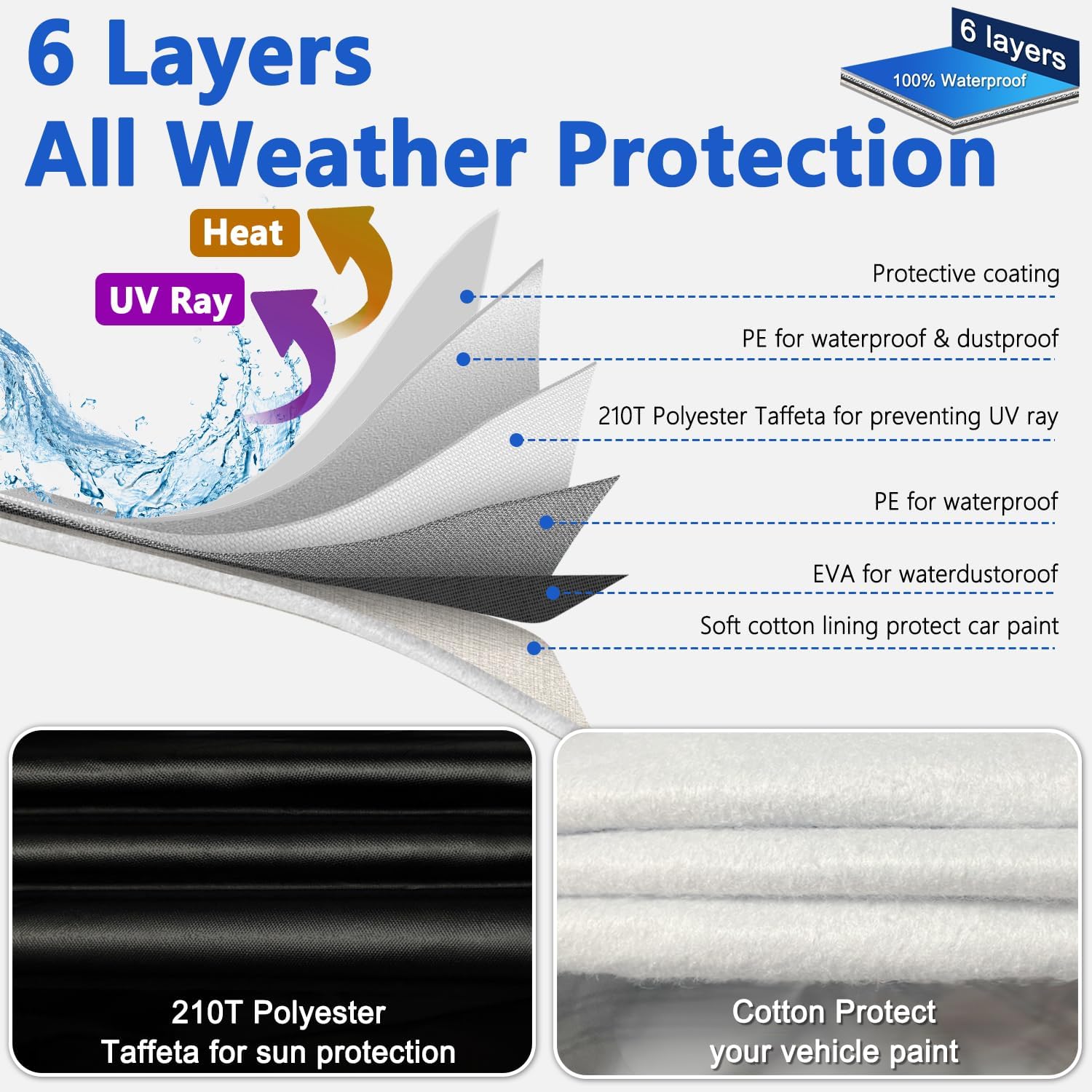 - 210T Polyester Taffeta & Cotton Lining - This car cover is made of high-density 210T Polyester Taffeta, lighter yet firmer, and withstand 2000mm water pressure so the car cover has better water resistance. The textile fabric is waterproof and heat insulation, yet air permeable and fast drying. The thicker and softer cotton will protect vehicle painting better, thickened cotton increases the fastness of the car cover and improves the ability to be tear-proof and scratch-proof.