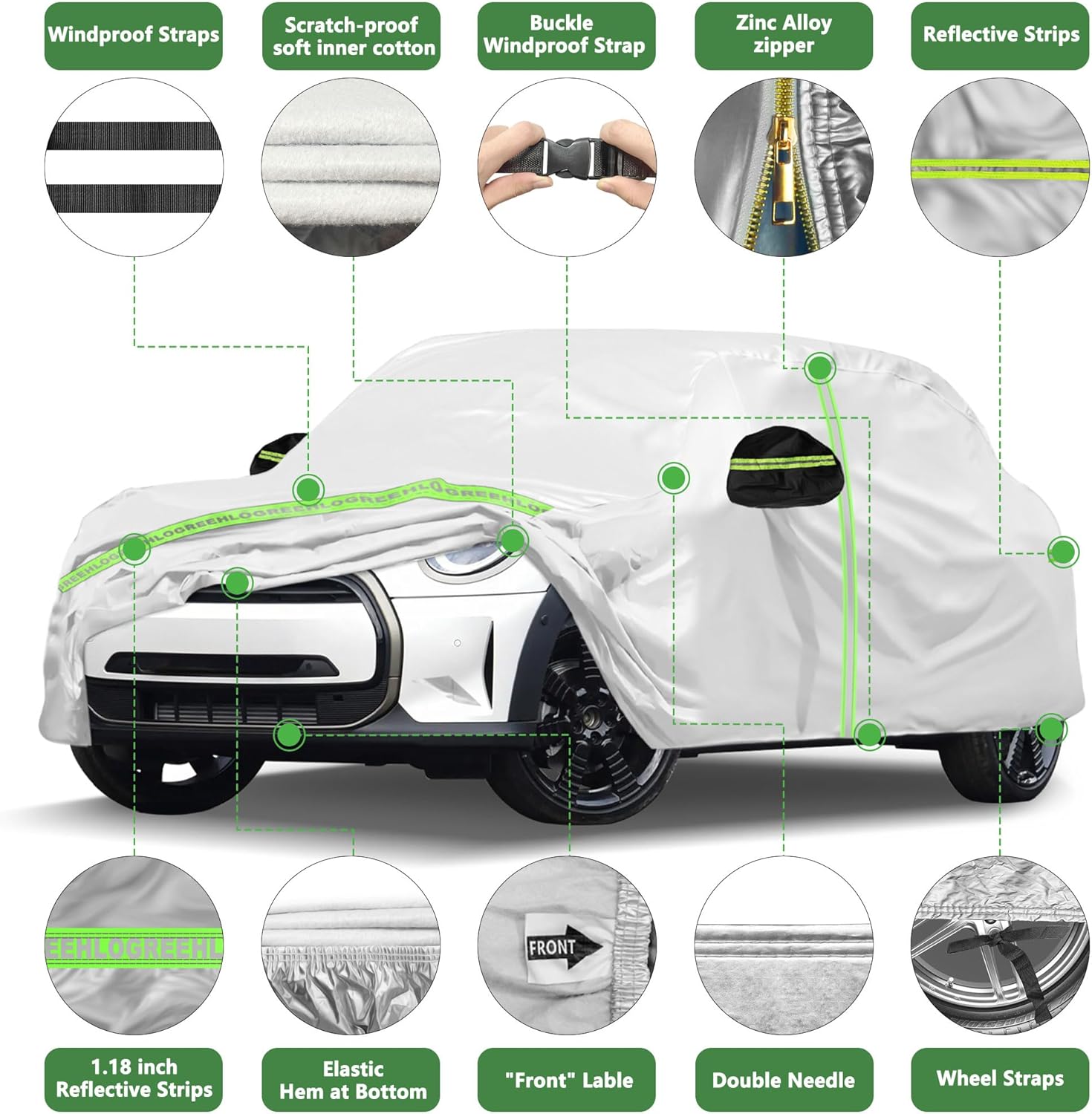 - What You Get - ① 1 x car cover for 2002-2025 Mini Cooper 2-Door ② 1 x storage bag ③ 2 set x Car Cover Bungee Cords & Clips ④ 2 x antenna grommet kits ⑤ User Instruction. Tips: Refer to the white " Front " tag to arrange the cover installation. When the cover is not in use, you can use the storage bag to store it inside the car's trunk. If you have any questions about the size and the installation, please contact us at any time.
