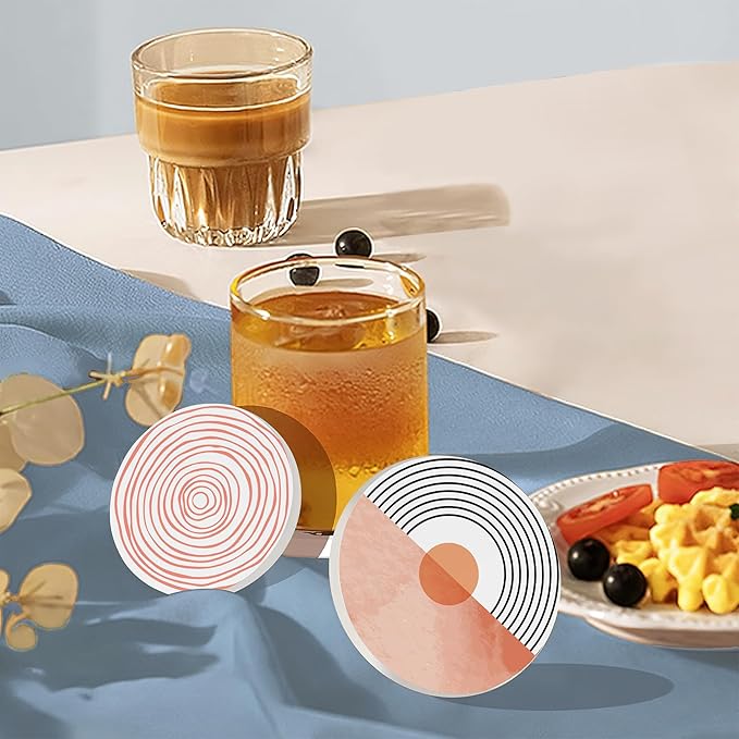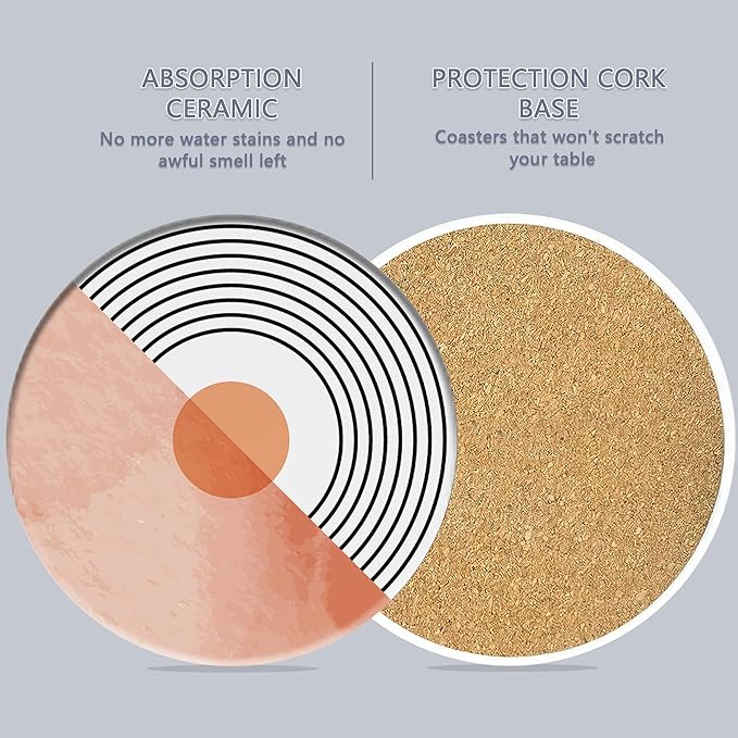 - Water-Absorbent And Cork Base: Crafted From Ceramic With a Cork Base, These Coasters Prevent Scratches And Water Stains While Providing a Non-Slip Effect For Your Drinks.