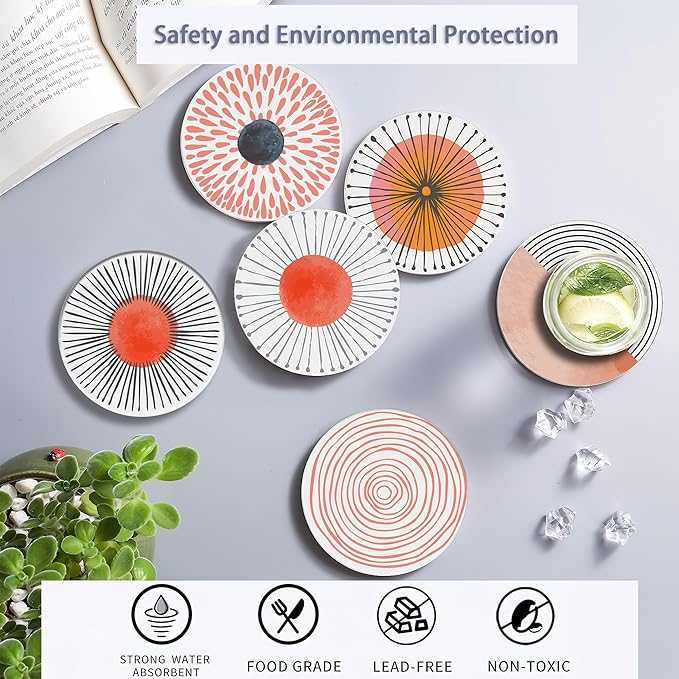 - Husiti Ceramic Coasters Set With Metal Holder: Keep Your Dining Table Stylish And Organized With This Set Of 6 4-Inch Round Coasters Featuring a Trendy Coral Watercolor Series Pattern.