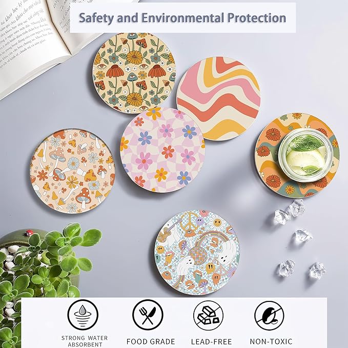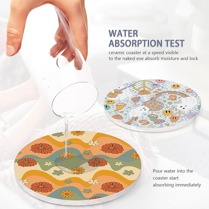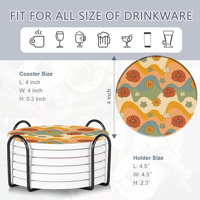 - Husiti Ceramic Coasters Set With Metal Holder: Keep Your Dining Table Stylish And Organized With This Set Of 6 4-Inch Round Coasters Featuring a Trendy Retro 70s Colorful Groovy Pattern.