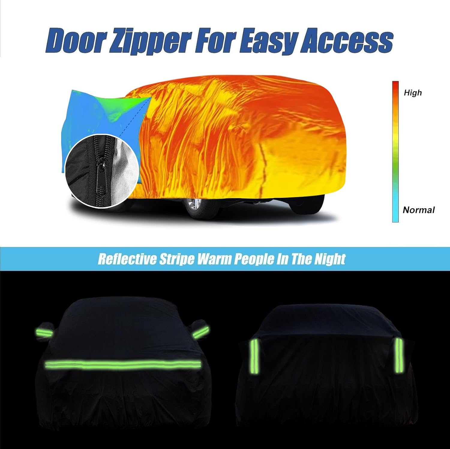 - 【Driver Side Zipper Design】Our car cover features a convenient driver's side zipper design for easy access. Additionally, it is equipped with night reflective strips on the surface for increased visibility at night, helping to prevent accidents. Mirror pockets are included to protect your mirrors from damage. Windproof straps ensure that the car cover remains secure even in windy conditions. It also comes with a combination lock to keep your cover securely fastened under your vehicle.