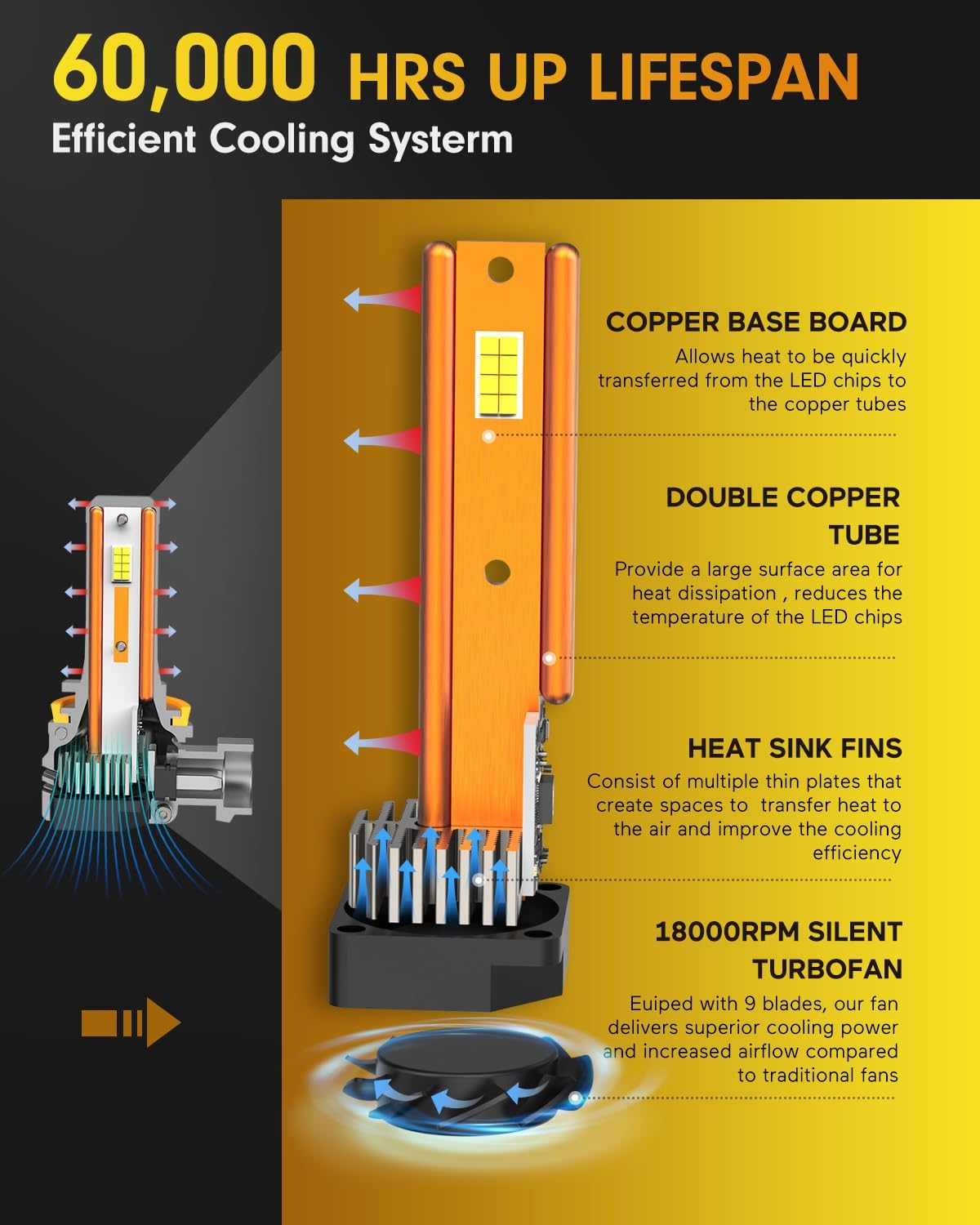 - γTriple Cooling System, 10+ Years of PerformanceγMade with aviation-grade aluminum and dual copper heat pipes,FAHREN 2025 H11/H8/H9 light bulbs dissipate heat up to 300% better than plastic models. Aluminum fins plus a 12,000RPM 9-blade silent fan form a triple cooling system for stable performance during extended high-power use. The finsβ aerodynamic design boosts efficiency and durability. The metal body resists corrosion and aging, and IP68 waterproof rating ensures reliability in all conditions. With 70,000+ hours lifespan, minimal brightness loss, and quiet, energy-efficient operation, these bulbs offer 10-year durabilityβideal for drivers seeking lasting performance.