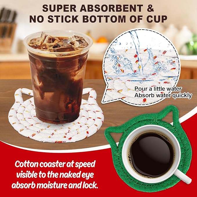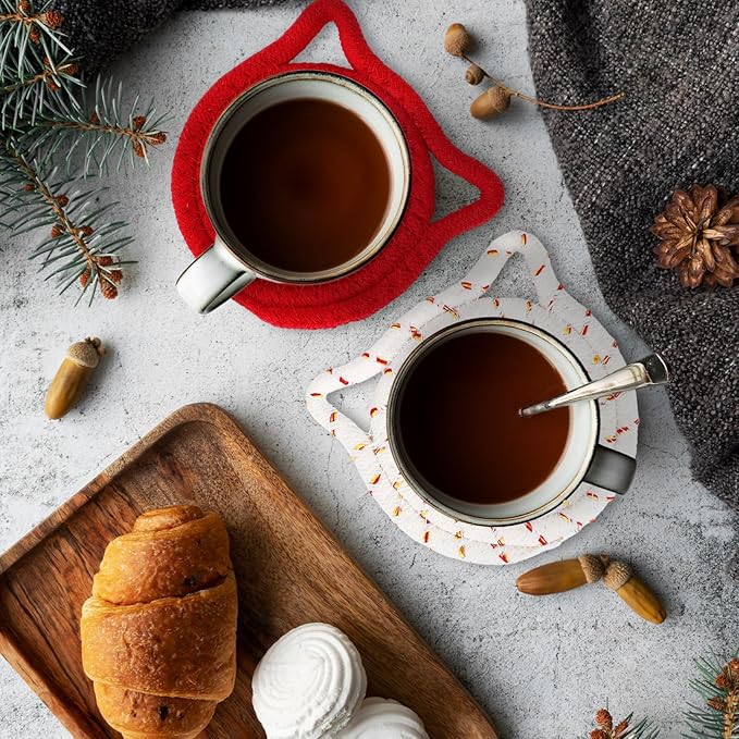 - Cat Ear Design - Our braided drink coasters featuring Christmas theme, designed with cat ear style, colored in red, green and gold, cute and delicate, which will greatly enhance holiday atmosphere for your home.