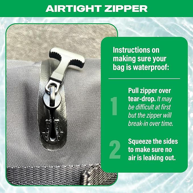 - Waterproof Zipper, airtight and pressure resistant to keep your gear dry. Protect your belongings from dust, water, snow and rain, and enjoy outdoor life. For the airtight zipper, please pull the zipper all the way to the end so that the zipper is fully closed, and before submerging the backpack in water, please press on the outside to make sure that there is no air leakage. This will ensure your gear will stay dry.
