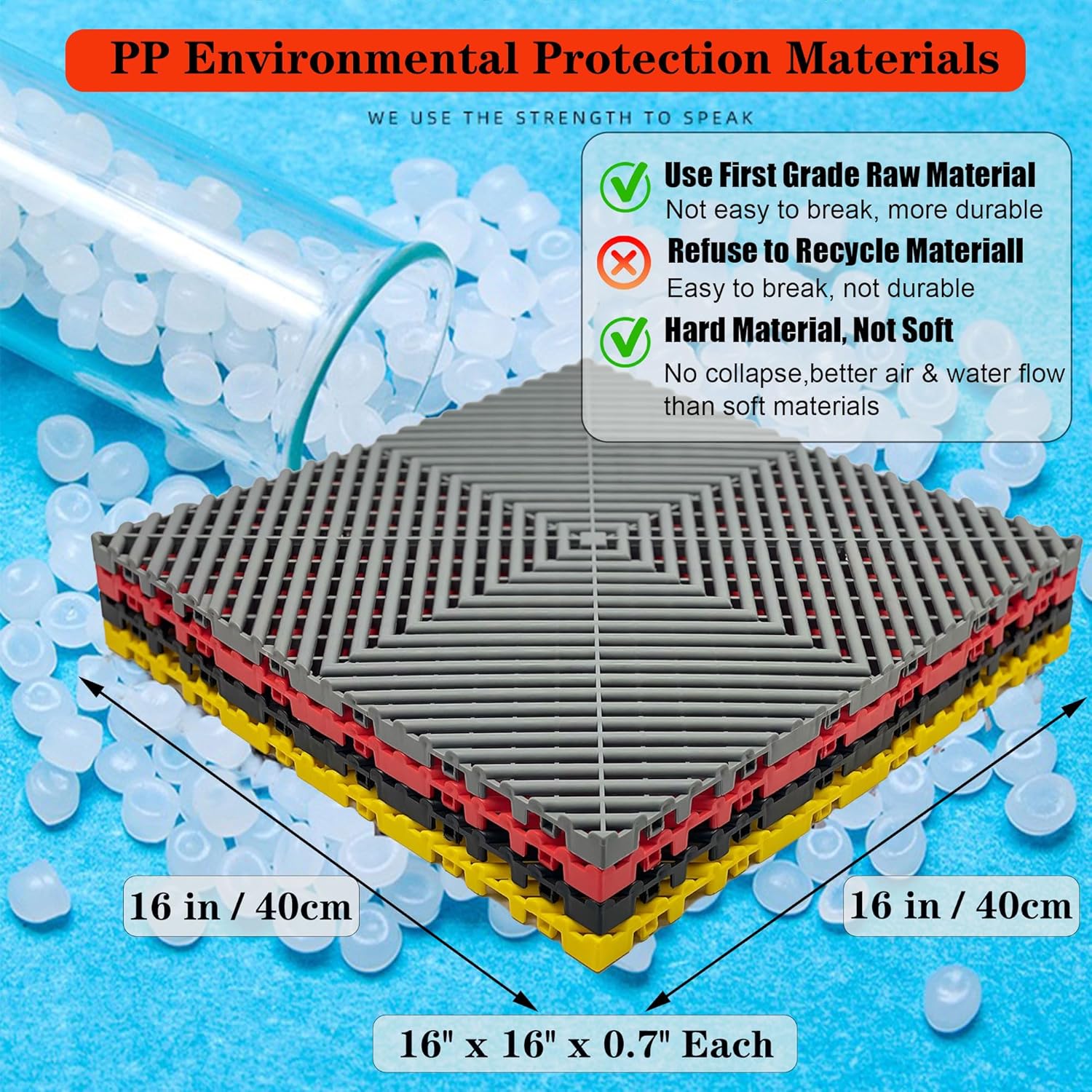 - Includes 12 Durable Tiles:Get 12 heavy-duty 16"x16"x0.71" interlocking drainage mats covering 20.7 sq ft for your garage, basement,workshop or wet areas
